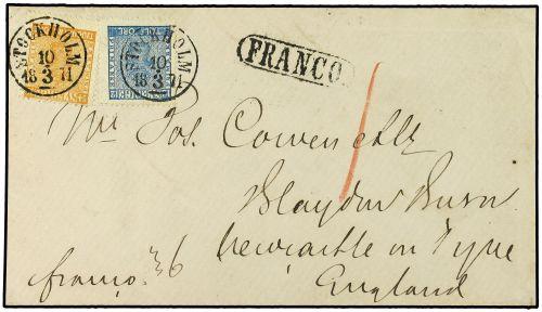 1871 (10 Marzo) ESTOCOLMO a NEWCASTLE (Gran Bretaña), a donde llegó el 16 de Marzo. Franqueada con sellos de 12 öre (Facit 9 x3) y 24 öre (Facit 10 h2).