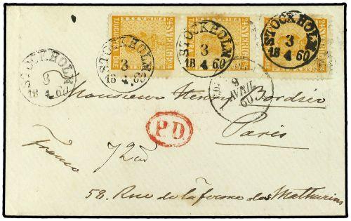 1860 (3 Abril) ESTOCOLMO a PARIS. Marca de entrada a Francia del 9 de Abril. Círculo vía Hamburgo (8 de Abril). Franqueo de 72 öre "correcto" con 3 sellos de 24 ö (Facit 10).