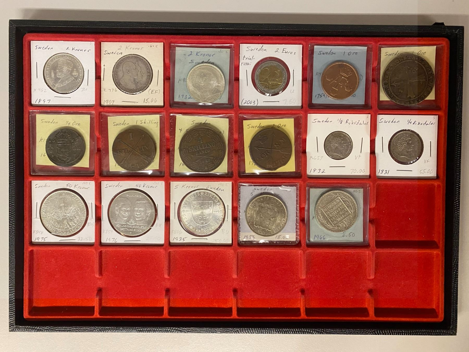 SWEDEN: LOT of 17 coins, including a 1645 1/4 ore (aEF), 1629 ore (F), 3 copper crowns (1768-1849, aEF), 3 2-kroner coins (1897-1932, AU), 5 modern UNC silver crowns, and 4 others; retail value $450, lot of 17 pieces.
