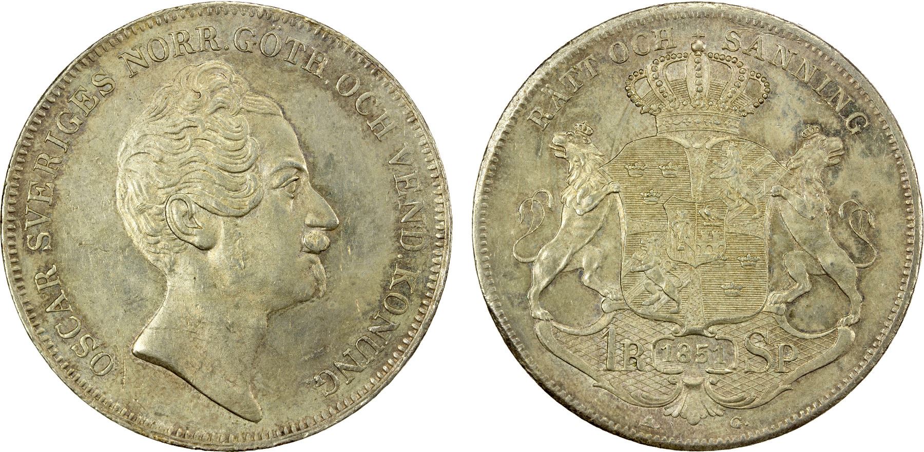 SWEDEN: Oscar I, 1844-1859, AR riksdaler, 1851, KM-667, initials AG, very lustrous with light toning, AU, ex Joe Sedillot Collection.
