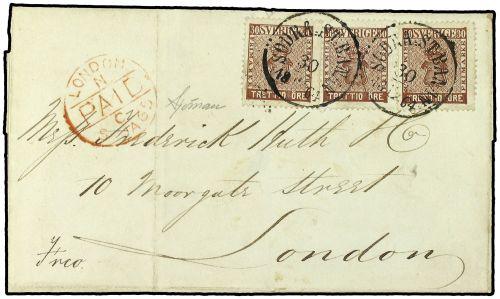 1864 (30 Diciembre) SODRA ST. BANAN a LONDRES vía Dinamarca y Hamburgo. Franqueada con 90 öre con 3 sellos de 30 öre. Cert. PER SJÖMAN.