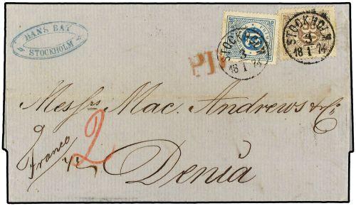 1874 (3-Enero) STOCKHOLM a DENIA (España). 12 ore y 30 ore, tarifa de 42 ore via Francia. Muy rara destinación.