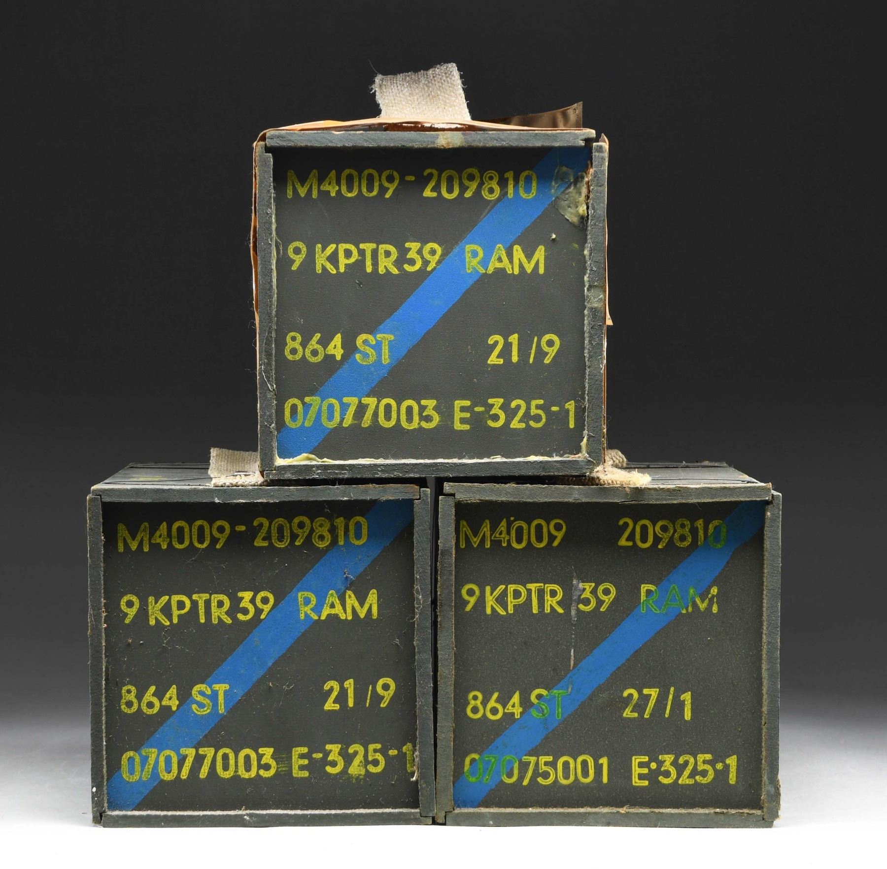 MG. Lot consists of approx. 2,300 rds contained in 2 sealed 864 rd fiberboard cases & 1 fiberboard case which has been opened. The opened case contains the balance of the ammunition in 12 unopened 36 rd blue paper boxes as well as a number of loose cartridges. The cartridges are intended for indoor training & practice in the Model 45 submachine gun. The bullets have a steel pellet inside a plastic sabot which disintegrates upon firing, leaving the steel ball to penetrate the target. This ammunition was fired in a special adapter & should not be used in conventional firearms. The brass cased cartridges have a blue sealant w/ a black colored bullet & a silver tip. CONDITION: the sealed boxes have retained most of their dark green paint w/ legible markings. The open case has notable wear * handling marks. Cartridges appear clean & serviceable. (02-23751/RW). AMMO. $600-800.