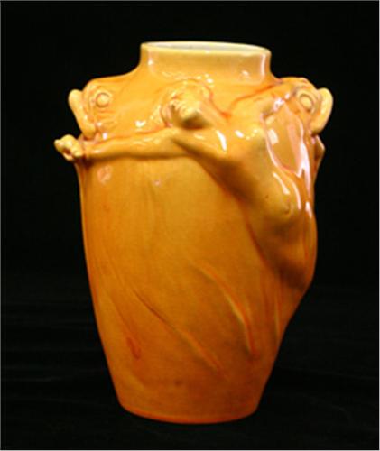 VAS, ORANGE GLASYR, DEKOR I RELIEF AV NAKEN KVINNA OCH FISKHUVUDEN, ALF WALLANDER, RÖRSTRAND, JUGEND C. 1900, H23 (OBETYDLIG GLASYRNAGG)