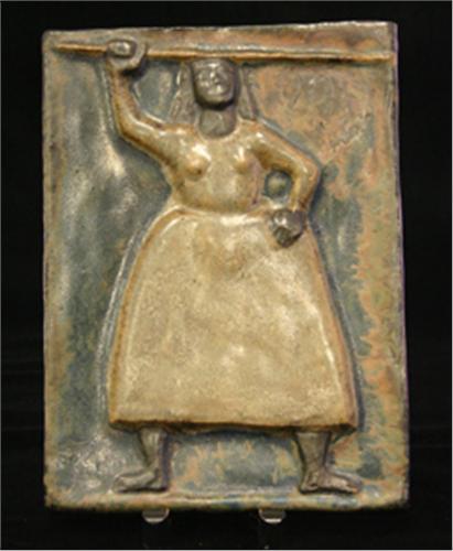 RELIEF, KVINNA MED KÄPP, BLÅGRÅ GLASYR, ÅKE HOLM, 32X22