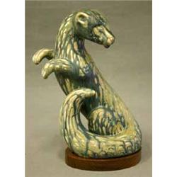 FIGURIN, STÅENDE UTTER PÅ TRÄSOCKEL, GRÖNSPRÄCKLIG GLASYR, GUNNAR NYLUND, RÖRSTRAND, H31