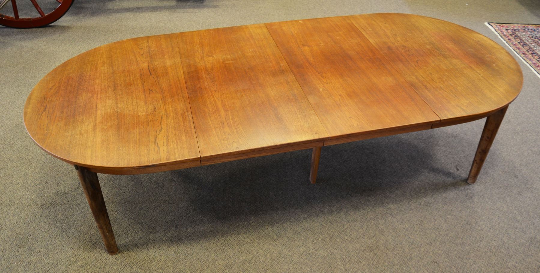 Mid 20th Century. The solid oval top projected above a straight apron, raised on four tapering oval legs and a central pair of central supports with metal braces for use when table is fully extended. Marked "AB Karl Anderson & Söner. Design Børge Mogensen M.A.A., Made in Sweden". SIZE: overall 28 1/2" h x 51 1/2" w x 67" l with two additional 23 1/2" leaves. CONDITION: with original hand rubbed oil finish with some fading. (05-773/TG). $300-600.