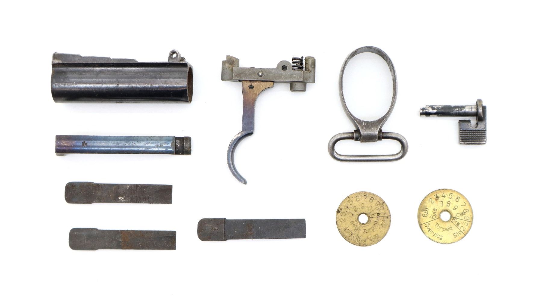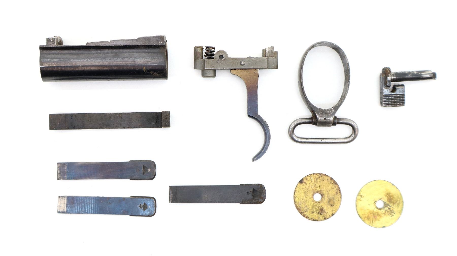 LOT INCLUDES; REAR SIGHT BASE, MIDDLE BAND, BAND RETAINER, TRIGGER & SEAR, SAFETY, (3) REAR SIGHT SPRINGS, (2) BRASS STOCK DISCS, ETC. MAY REQUIRE FITTING. SEE PHOTOS.