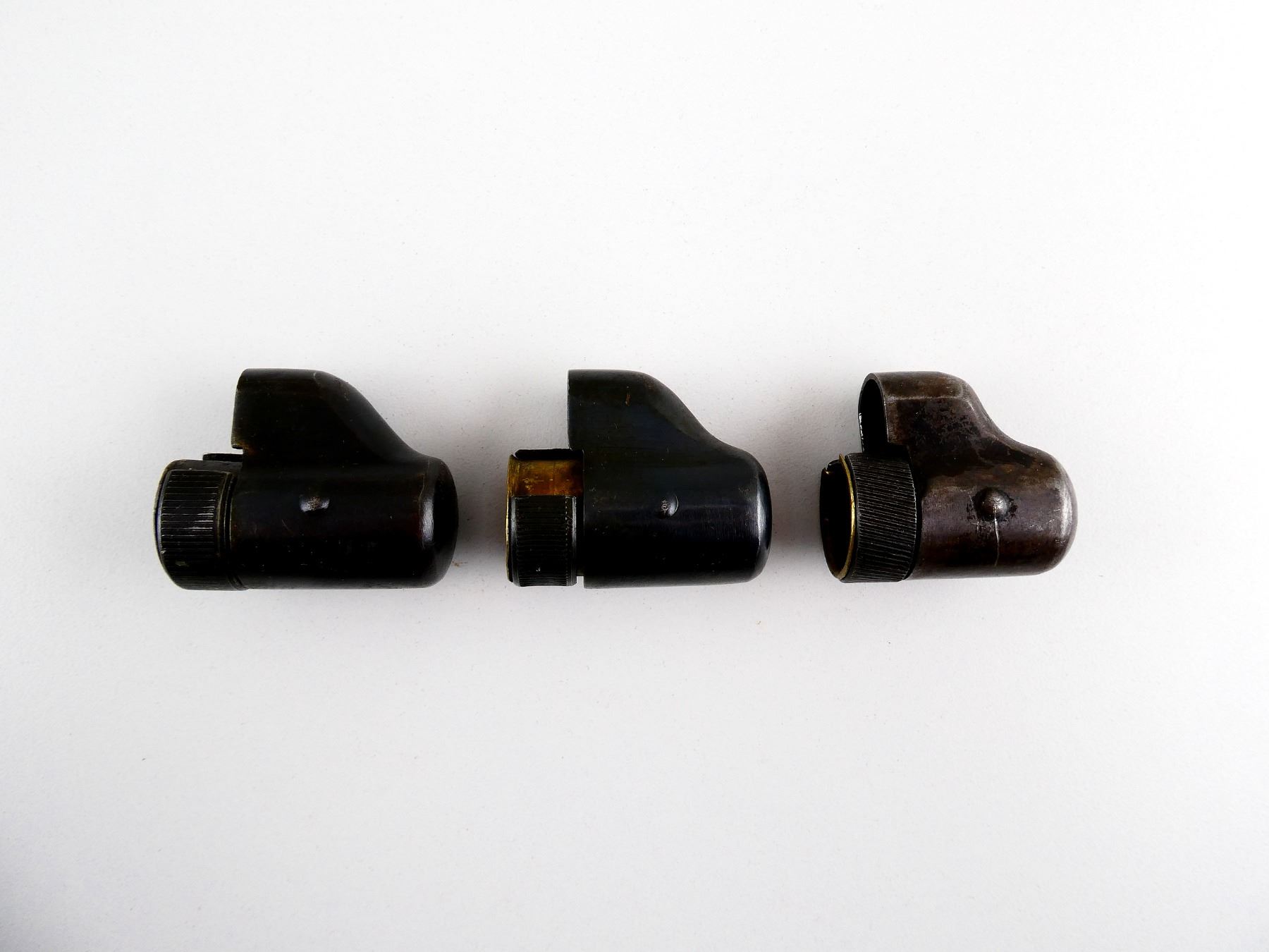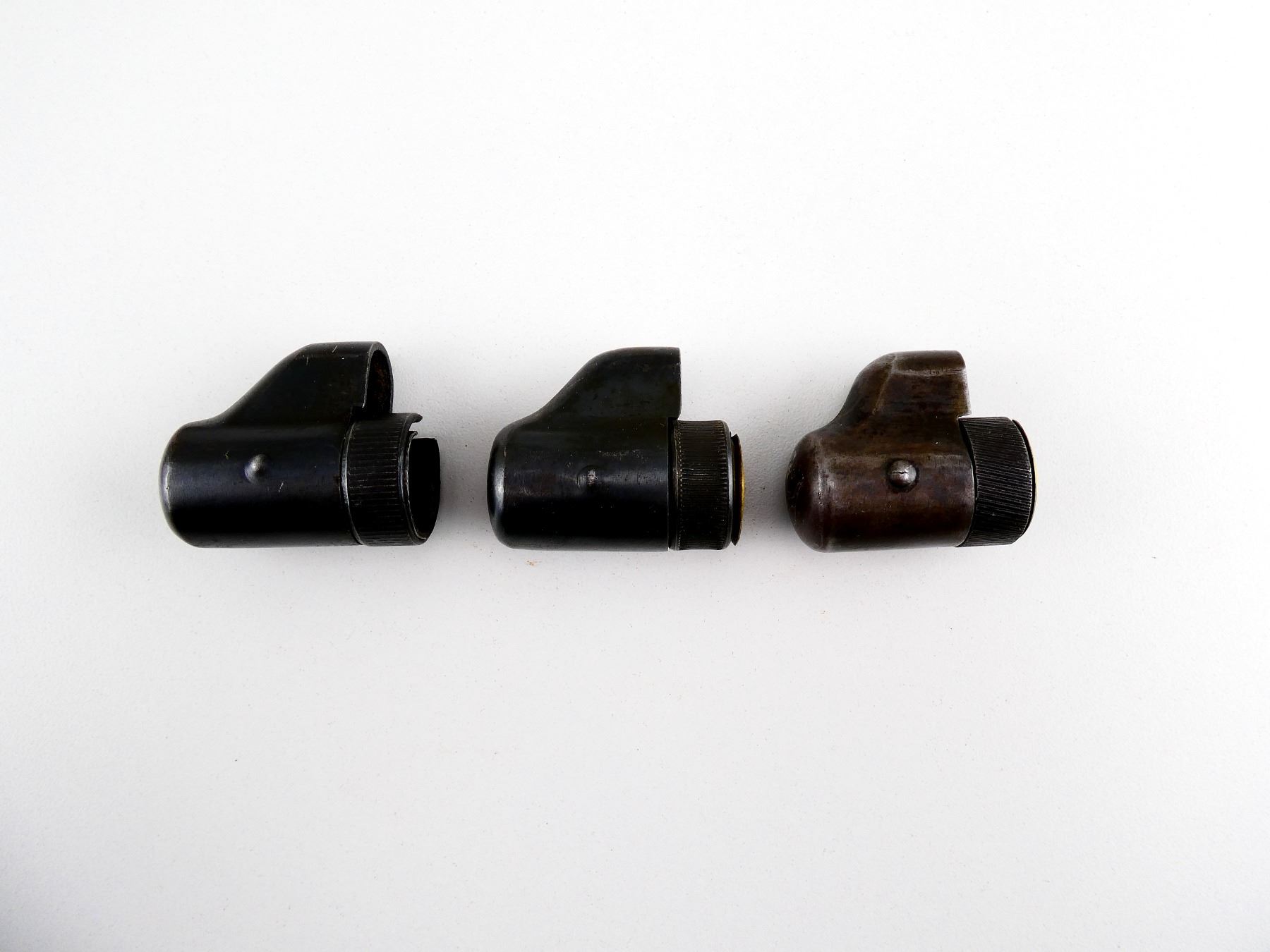 LOT INCLUDES; (3) MUZZLE / FRONT SIGHT COVERS, FITS SWEDISH 1896 / M38 MAUSERS, BLUED STEEL / BRASS CONSTRUCTION, NO VISIBLE MARKINGS. SEE PHOTOS.