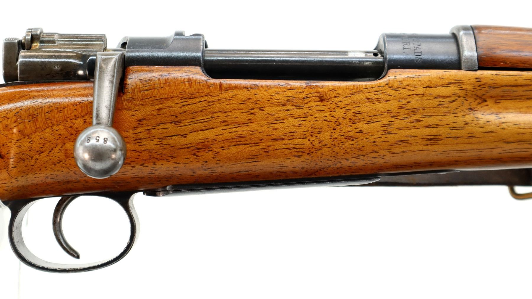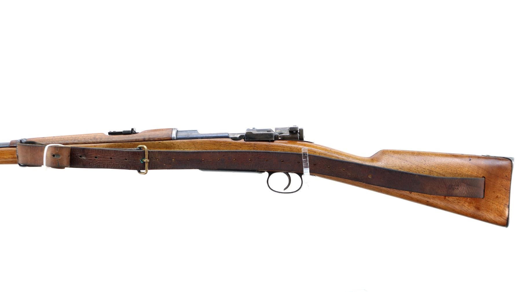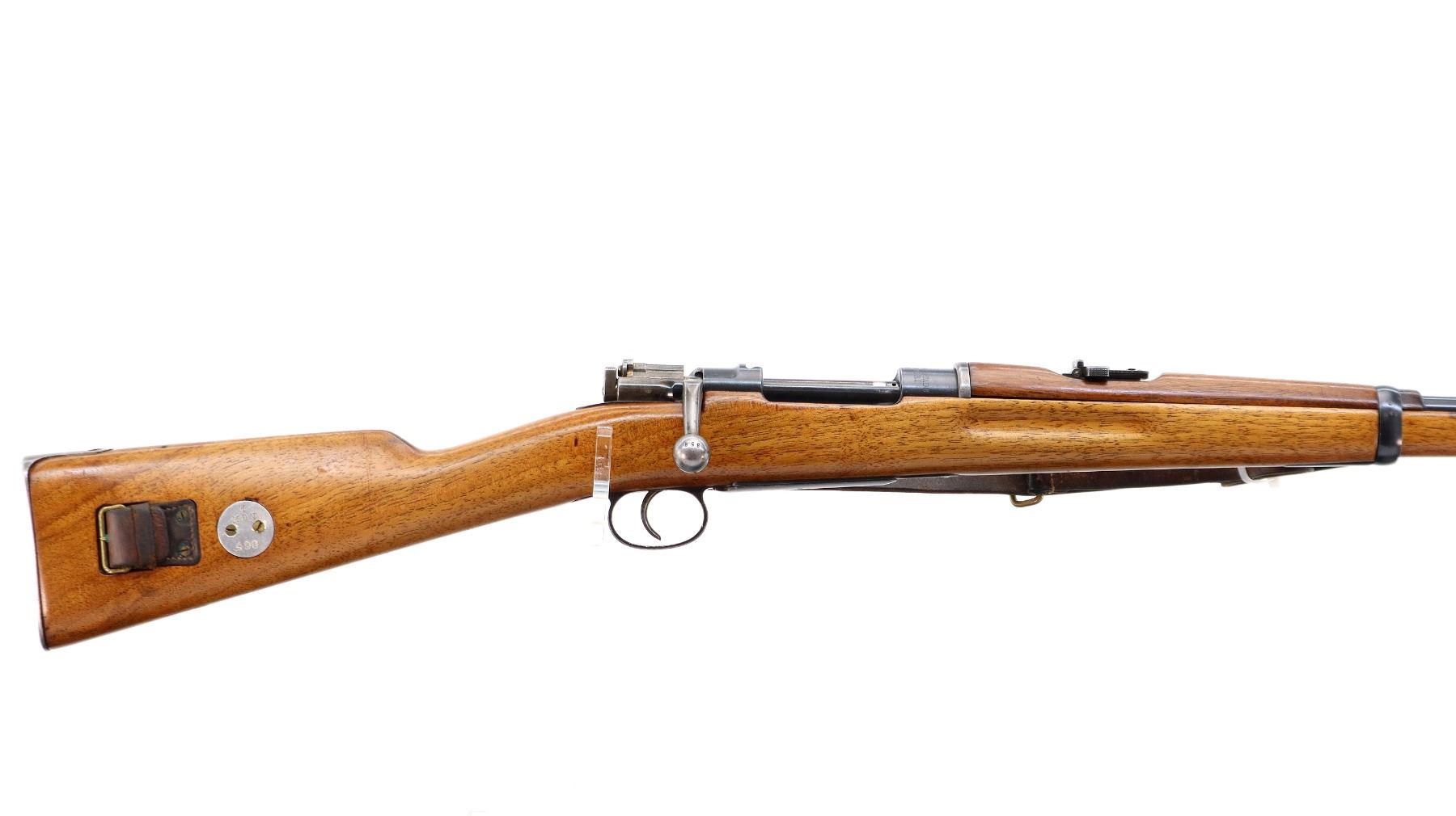 Main Description: Manufactured by Carl Gustafs 1903, visible numbers match. Barley corn front sight with ramp and ears, adjustable u notched ladder rear sight, blued finish, turned down bolt handle. Two piece refinished full military wood stocks, straight grip, smooth steel butt plate, aluminum stock disk marked M DN 490, rear sling buckle front swivel with brown leather military sling.