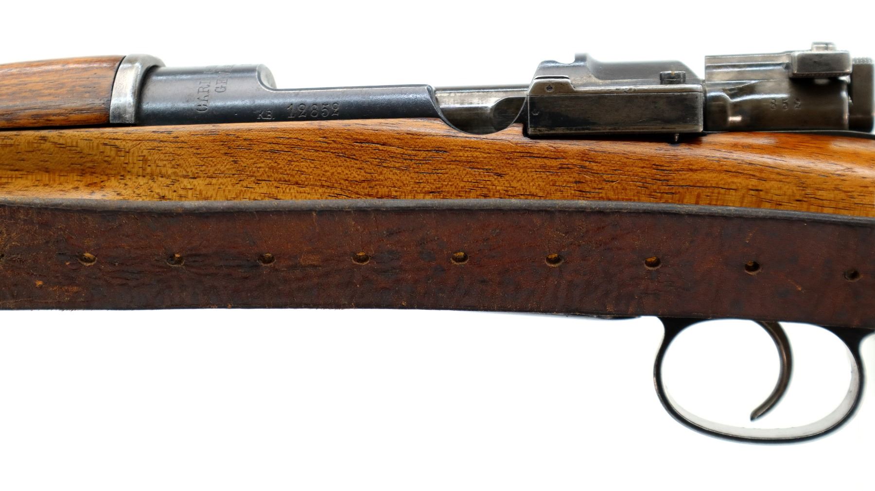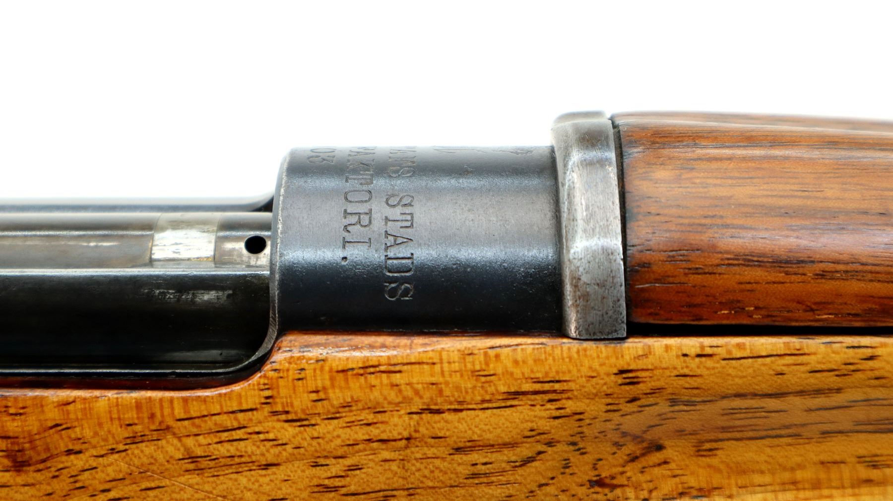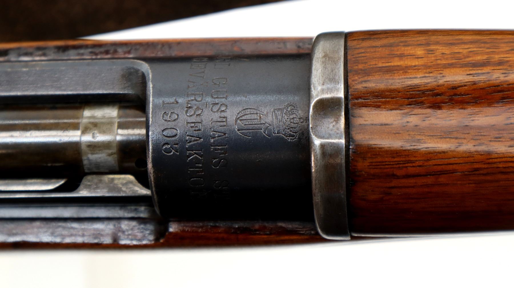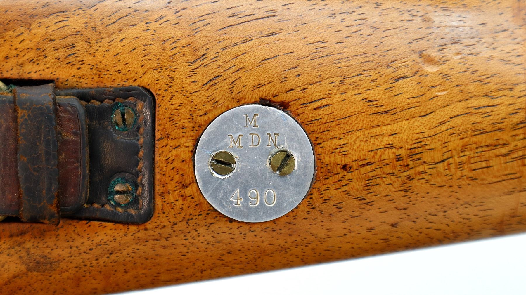 Main Description: Manufactured by Carl Gustafs 1903, visible numbers match. Barley corn front sight with ramp and ears, adjustable u notched ladder rear sight, blued finish, turned down bolt handle. Two piece refinished full military wood stocks, straight grip, smooth steel butt plate, aluminum stock disk marked M DN 490, rear sling buckle front swivel with brown leather military sling.