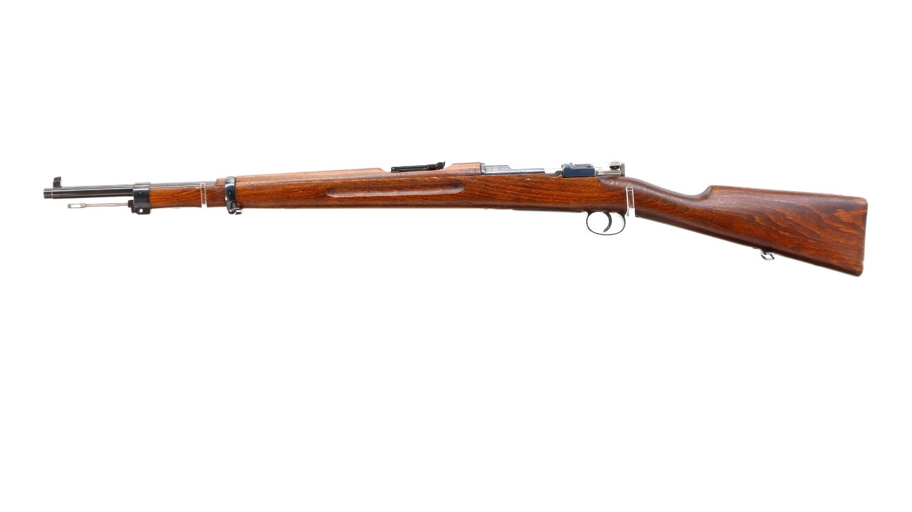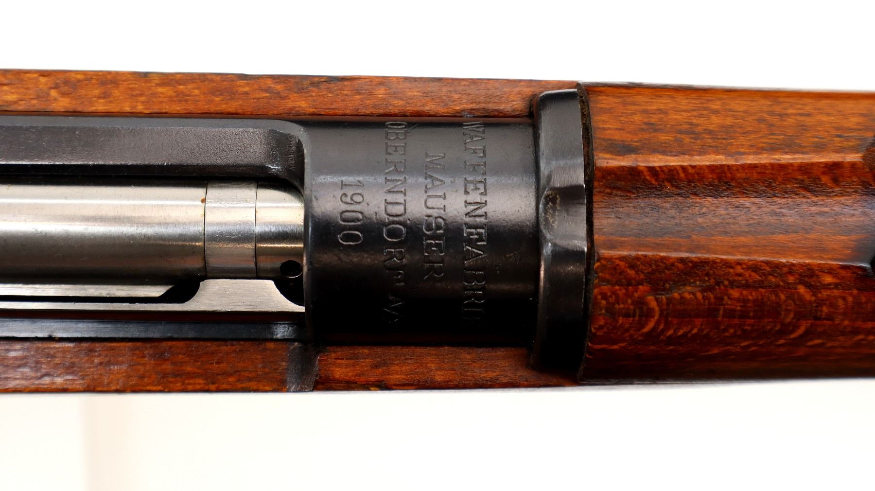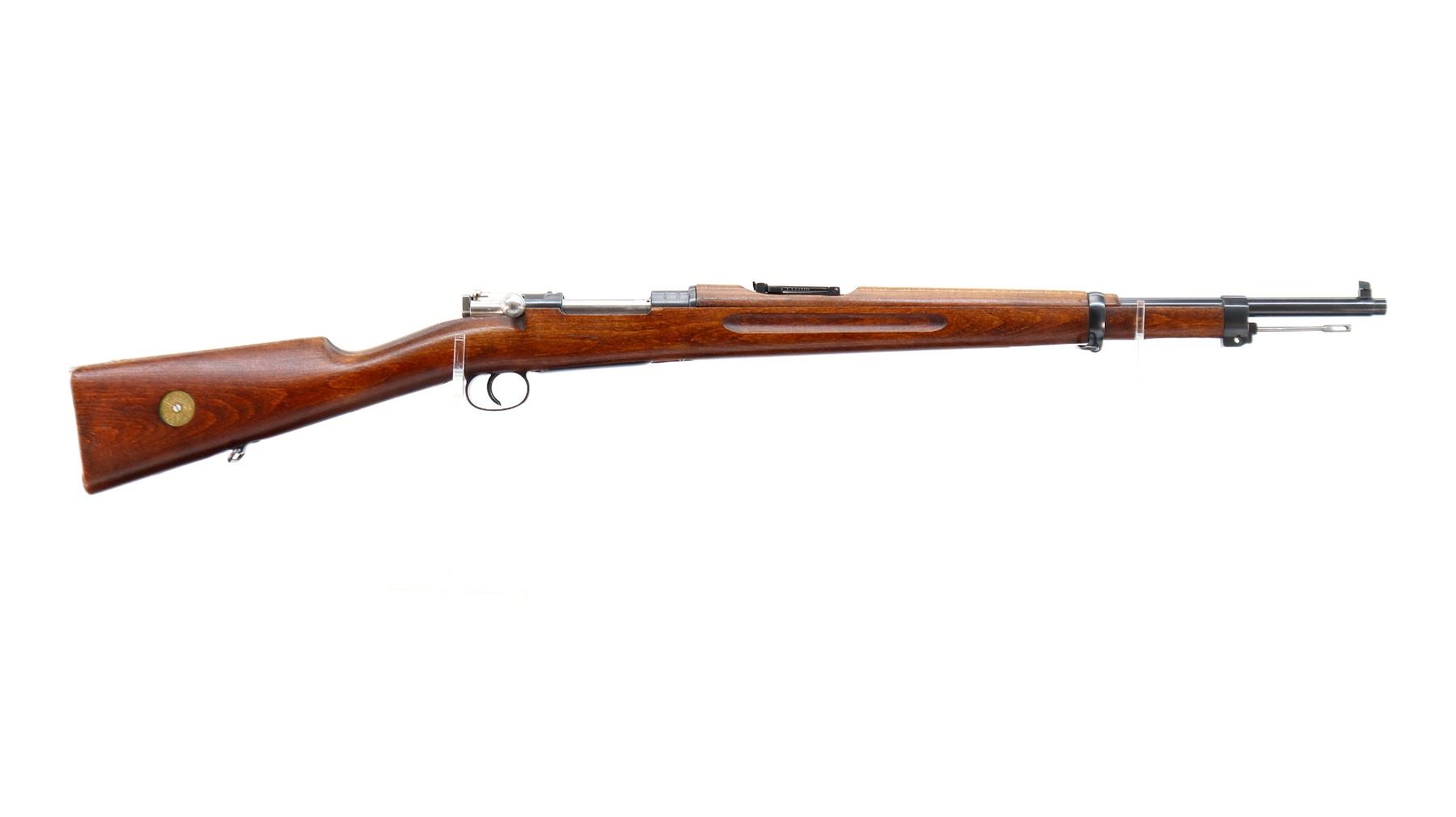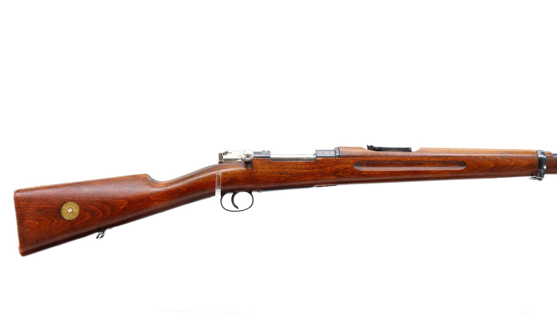 Main Description: Manufactured by Mauser Oberndorf 1900, visible numbers match. Blade front sight with ramp, adjustable u notched rear sight, blued finish, silver bolt with straight handle. Two piece full military wood stocks, finger grooved forearm, straight grip, smooth steel butt plate, brass stock disk on right side, sling swivels, bayonet lug, cleaning rod.