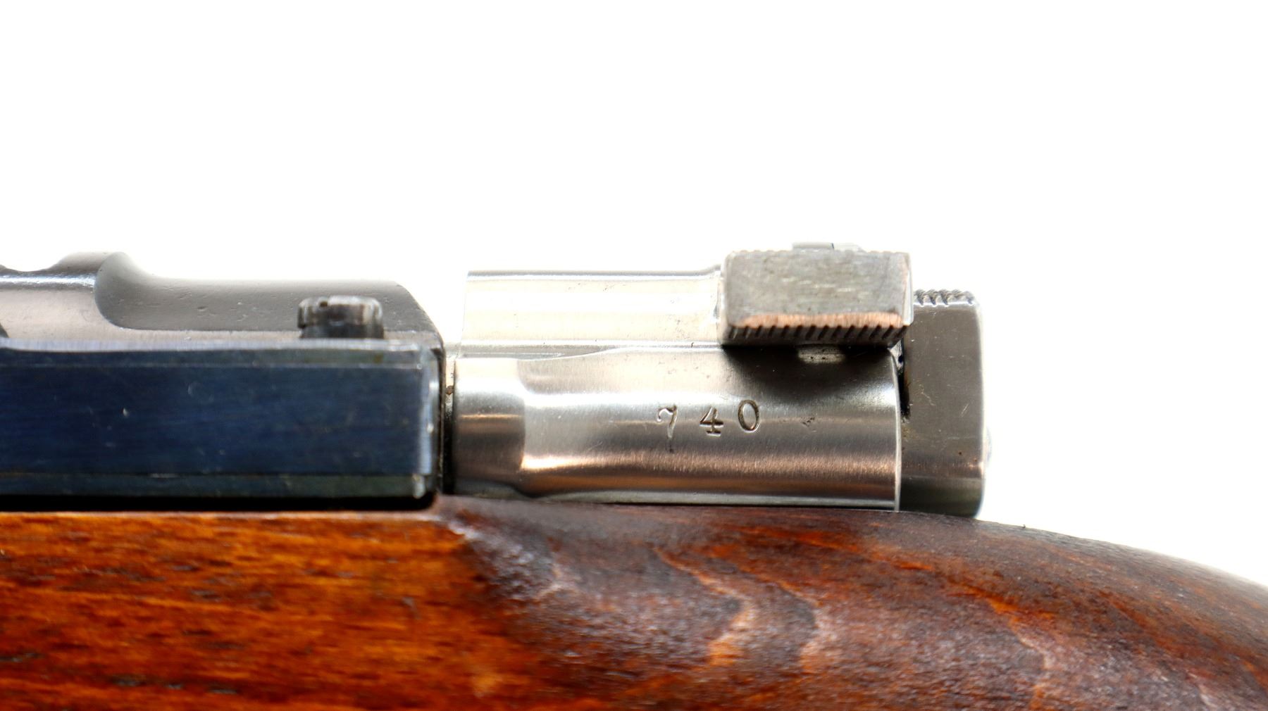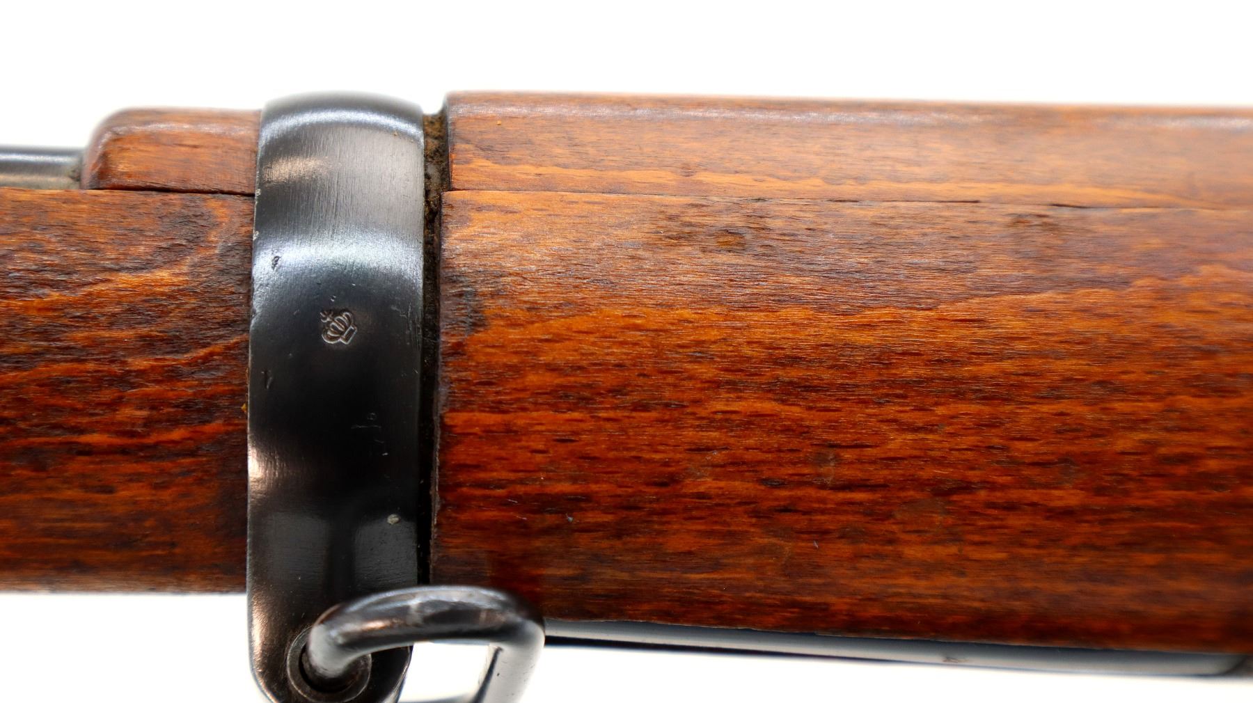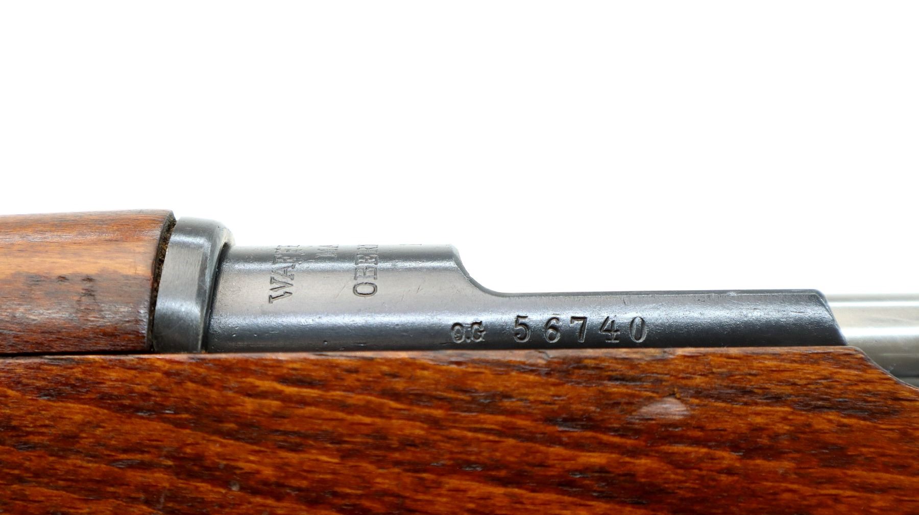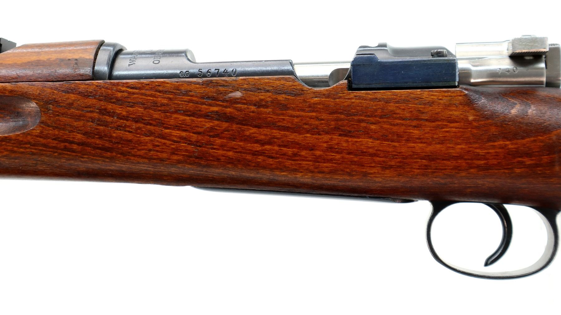 Main Description: Manufactured by Mauser Oberndorf 1900, visible numbers match. Blade front sight with ramp, adjustable u notched rear sight, blued finish, silver bolt with straight handle. Two piece full military wood stocks, finger grooved forearm, straight grip, smooth steel butt plate, brass stock disk on right side, sling swivels, bayonet lug, cleaning rod.