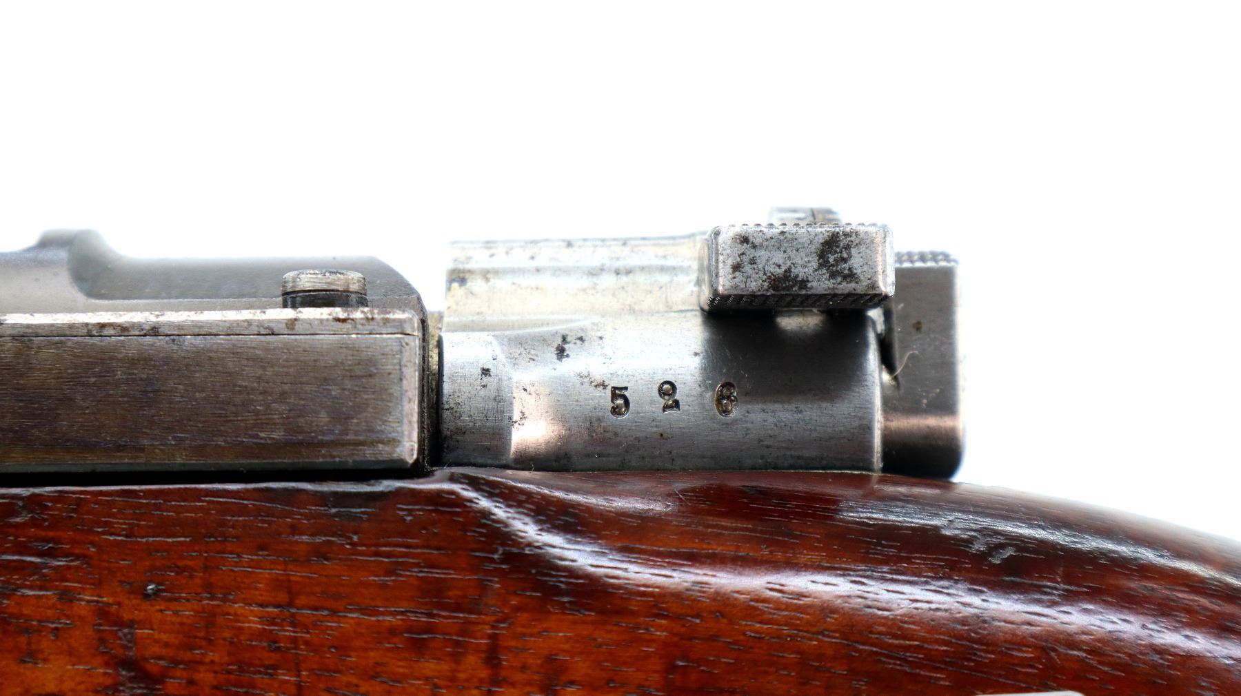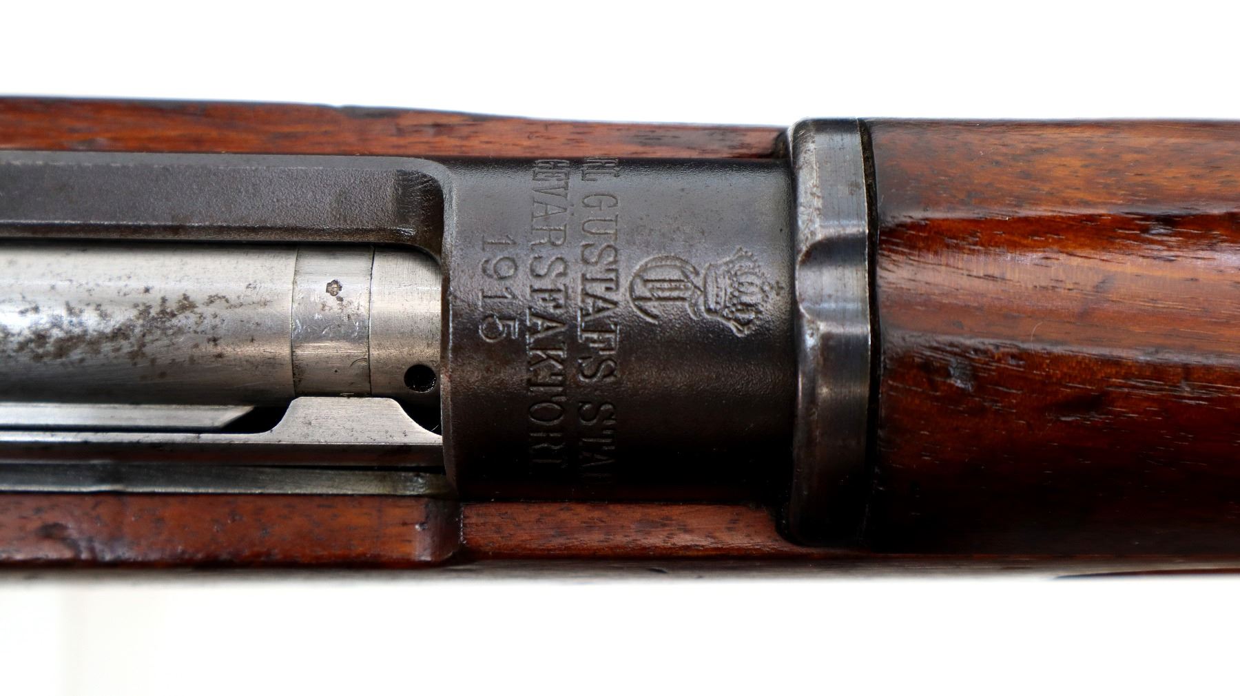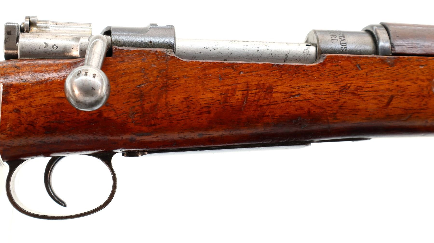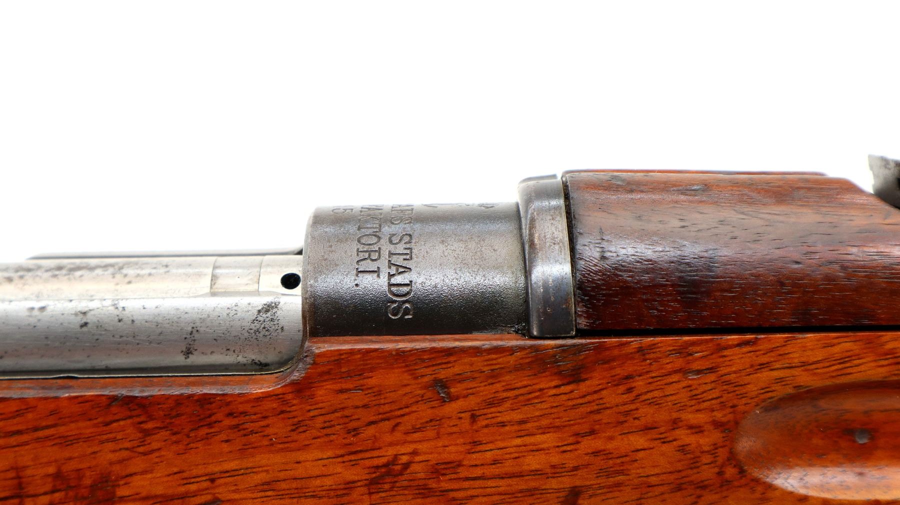 Main Description: Manufactured by Carl Gustafs 1915, bolt mismatched other parts match. Blade front sight with ramp, adjustable u notched rear sight, blued finish, silver bolt with modified handle. Two piece full military wood stocks, finger grooved forearm, straight grip, smooth steel butt plate, brass stock disk and range sticker on right side, sling swivels, cleaning rod, bayonet lug.