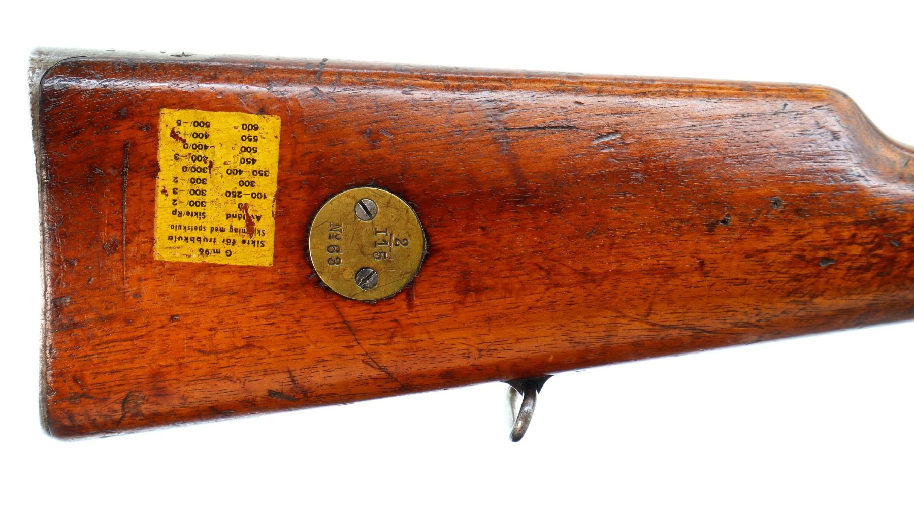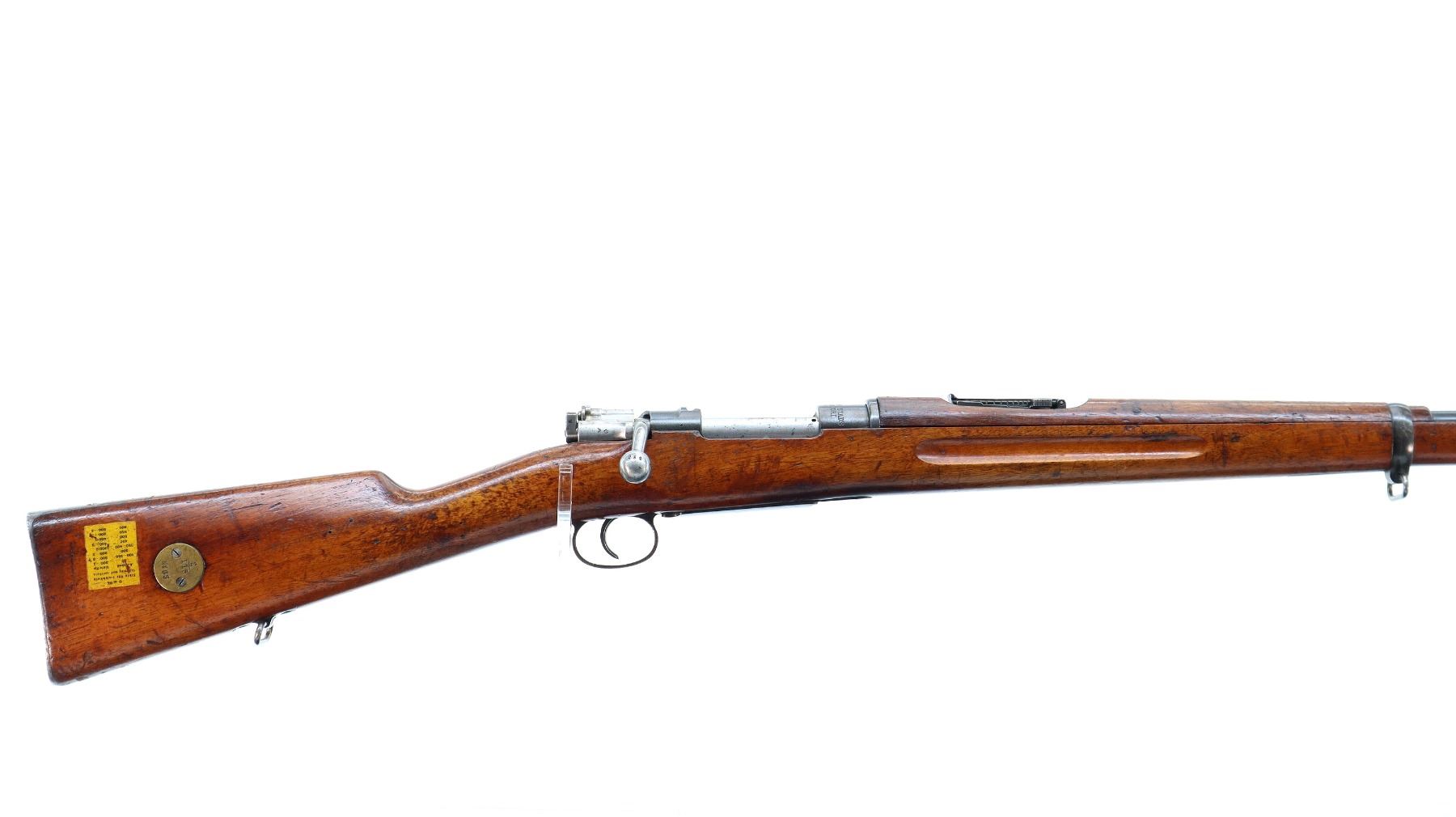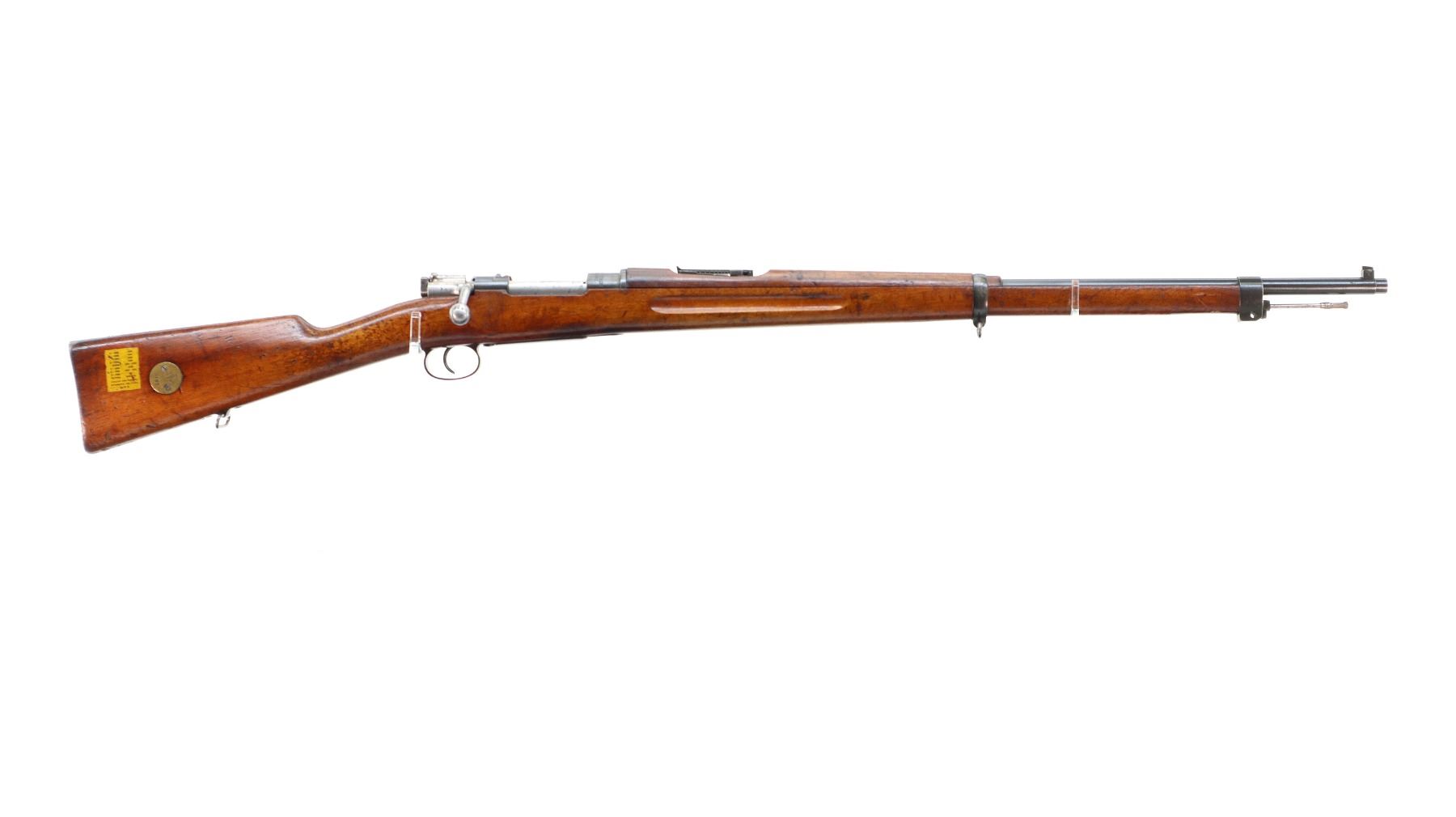 Main Description: Manufactured by Carl Gustafs 1915, bolt mismatched other parts match. Blade front sight with ramp, adjustable u notched rear sight, blued finish, silver bolt with modified handle. Two piece full military wood stocks, finger grooved forearm, straight grip, smooth steel butt plate, brass stock disk and range sticker on right side, sling swivels, cleaning rod, bayonet lug.