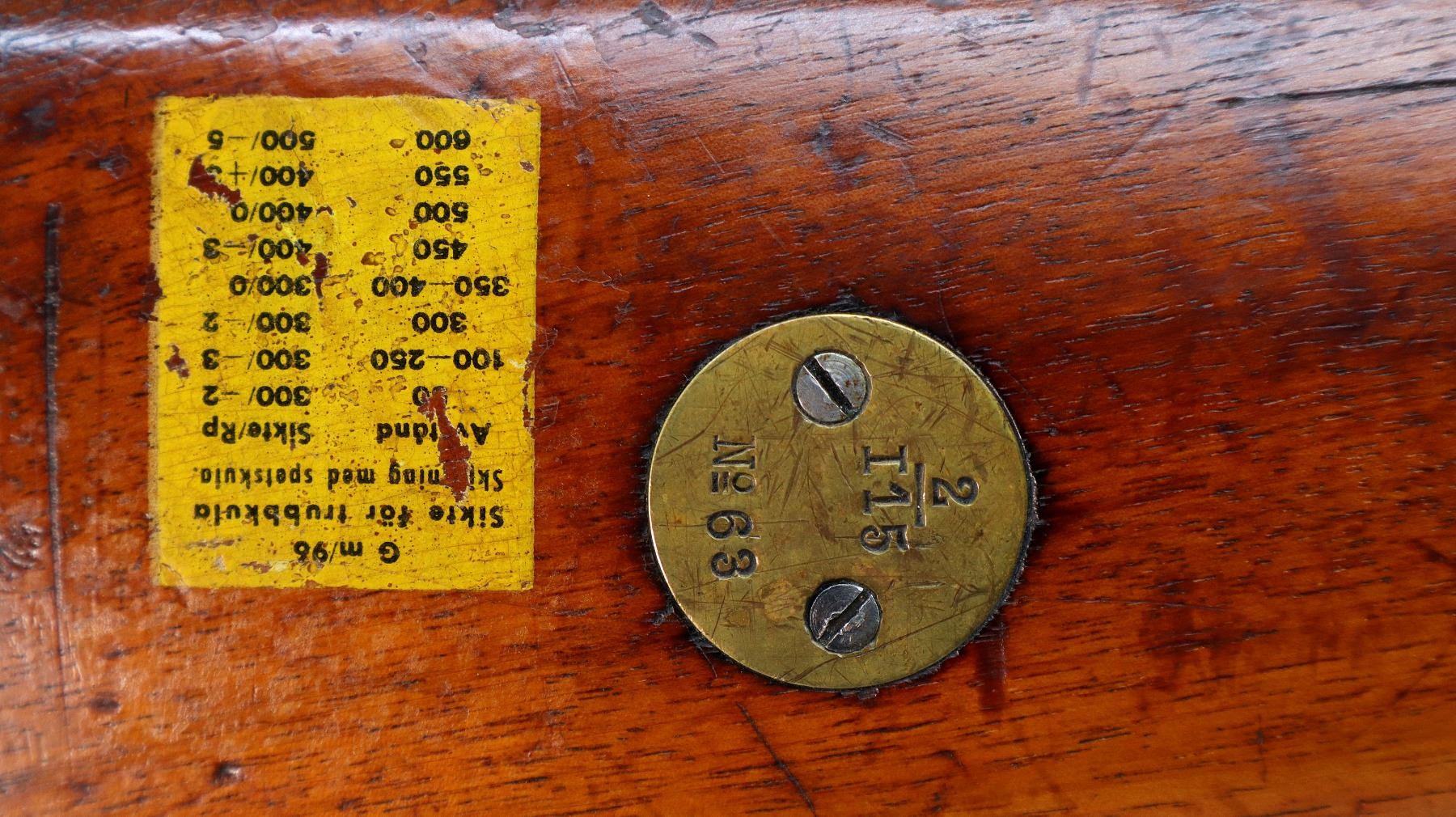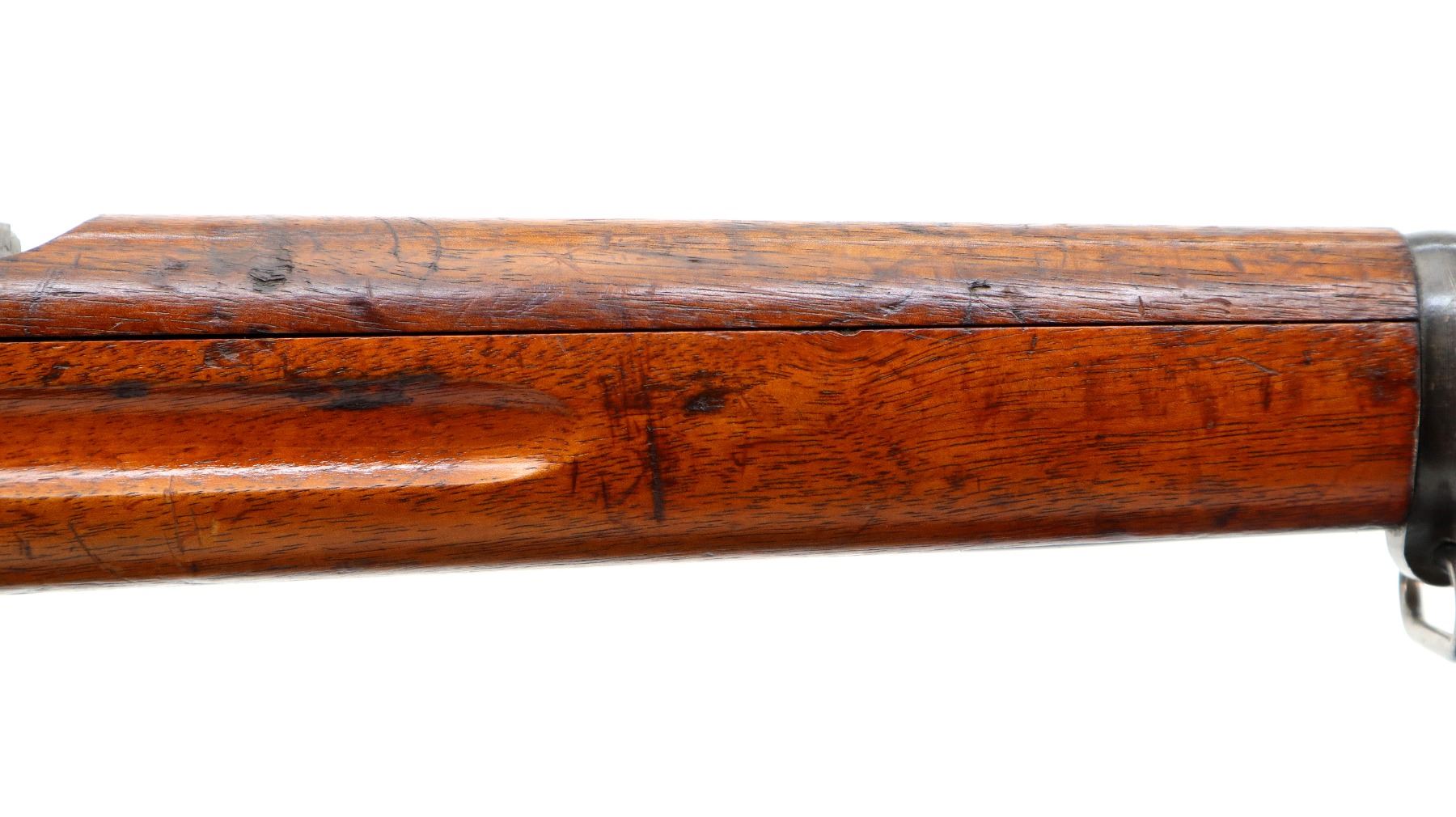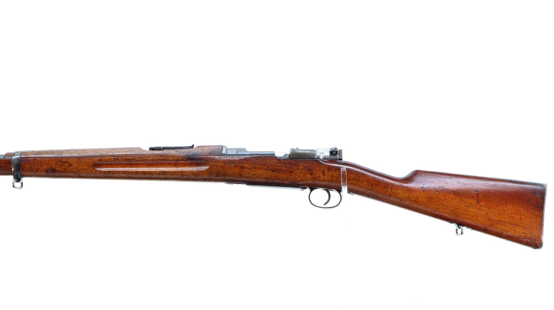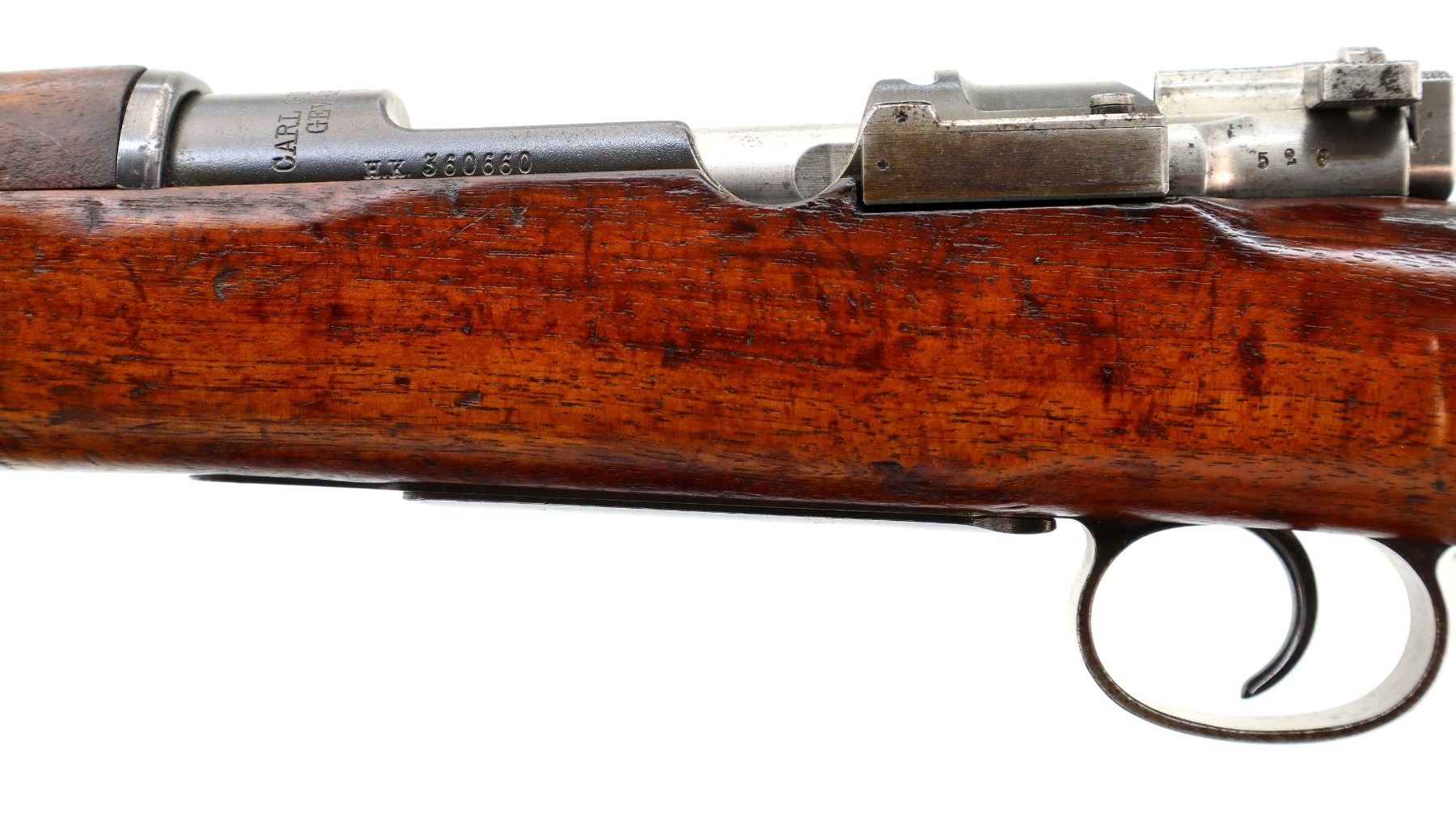 Main Description: Manufactured by Carl Gustafs 1915, bolt mismatched other parts match. Blade front sight with ramp, adjustable u notched rear sight, blued finish, silver bolt with modified handle. Two piece full military wood stocks, finger grooved forearm, straight grip, smooth steel butt plate, brass stock disk and range sticker on right side, sling swivels, cleaning rod, bayonet lug.