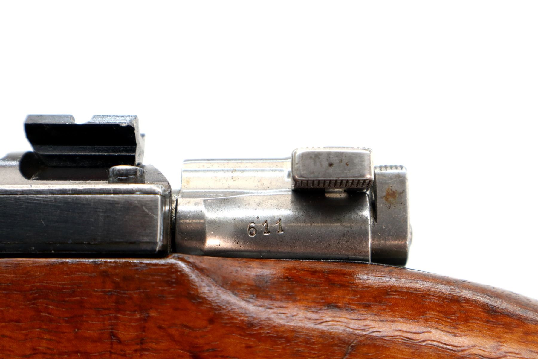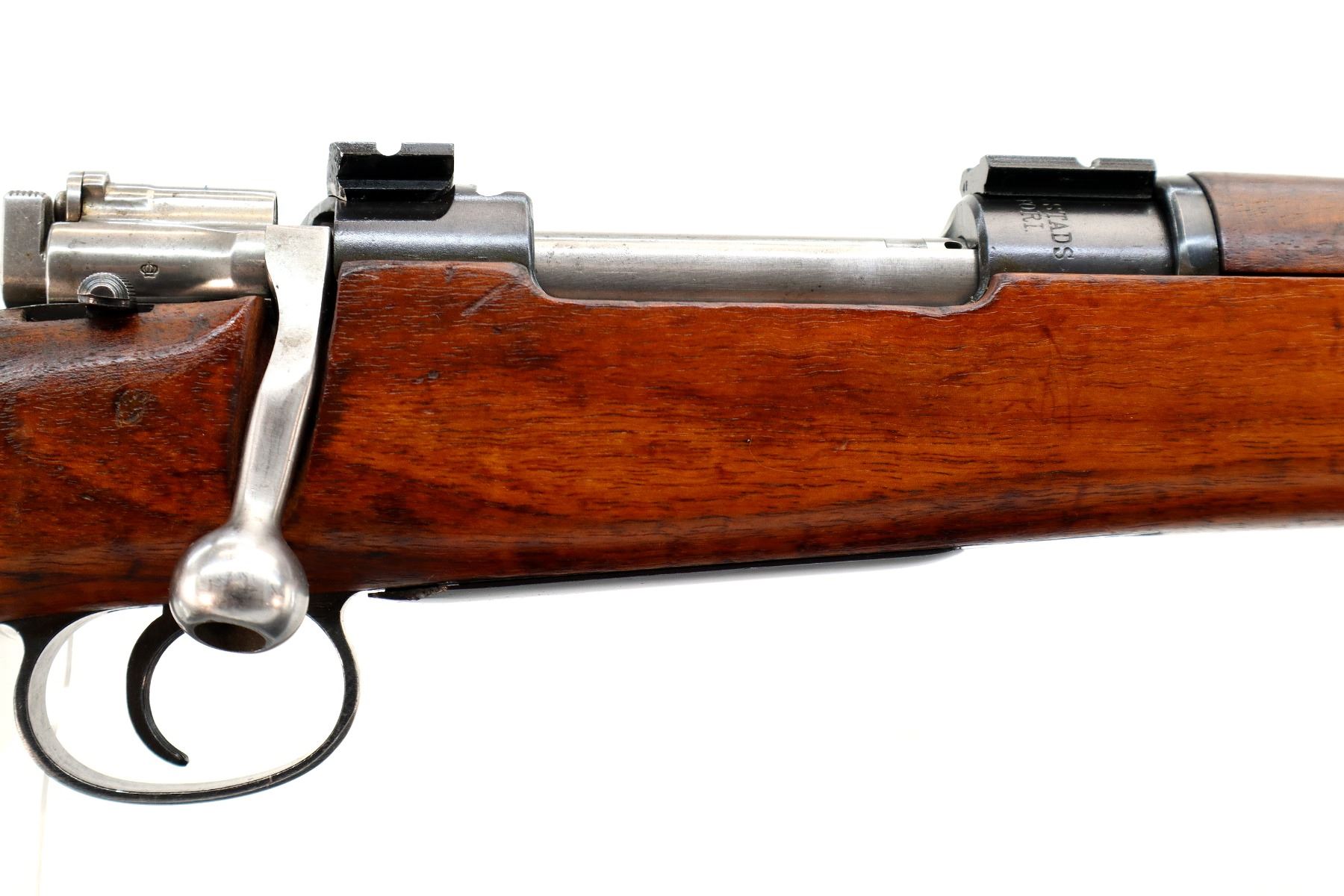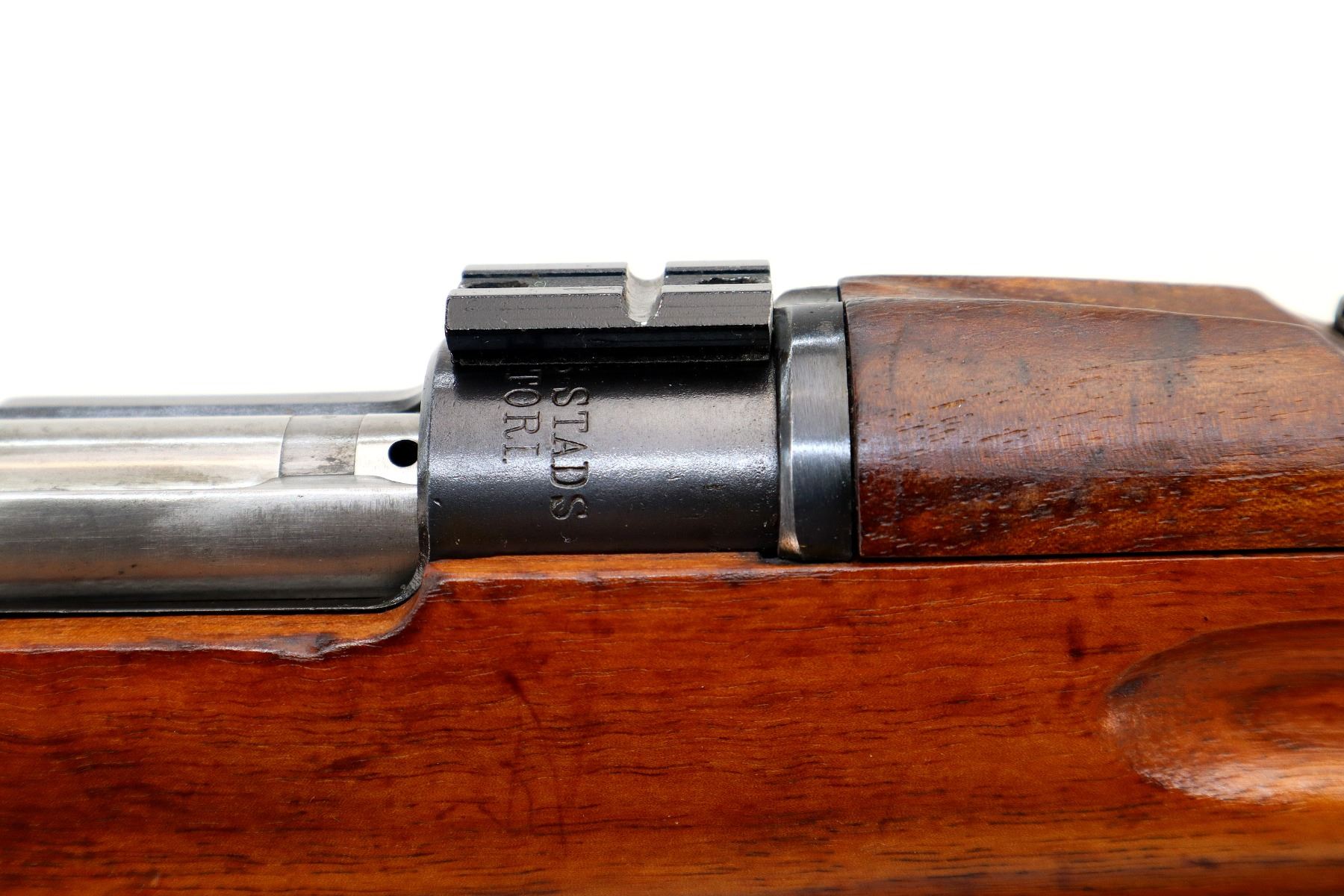 Main Description: Manufactured by Carl Gustafs, serial numbers mismatched. Blade front sight with ramp, missing rear sight base and spring present, blued finish, receiver drilled and tapped with two piece scope bases installed, silver bolt with modified handle, adjustable trigger installed. Two piece full military wood stocks, finger grooved forearm, straight grip, smooth steel butt plate, brass stock disk, sling swivels, bayonet lug, missing cleaning rod.