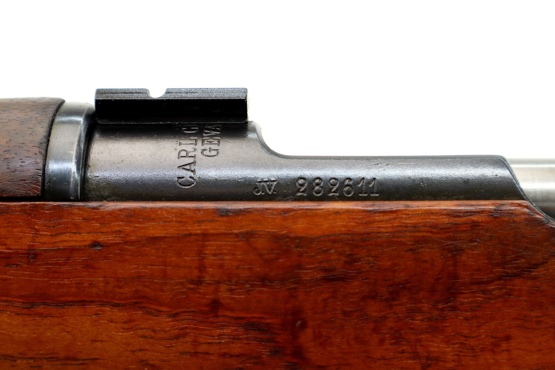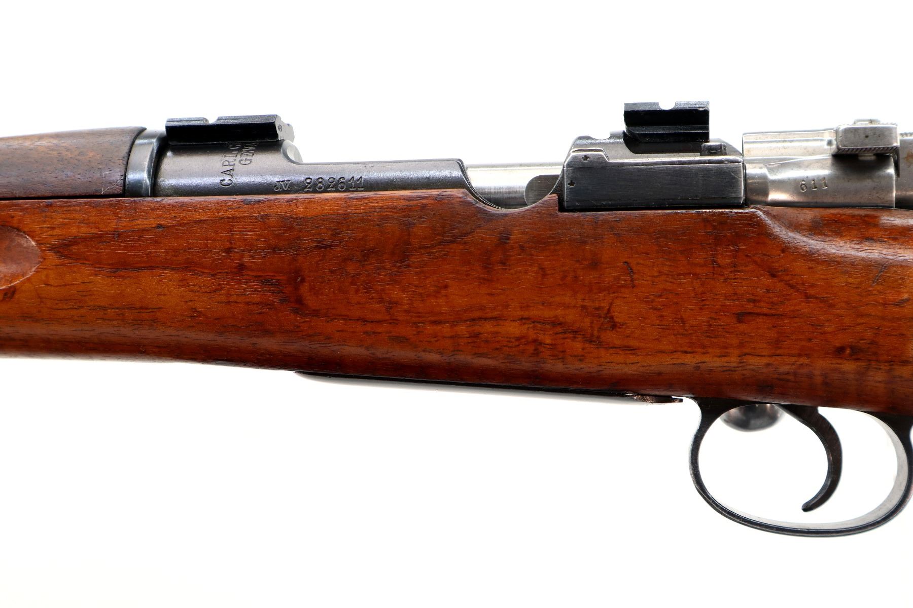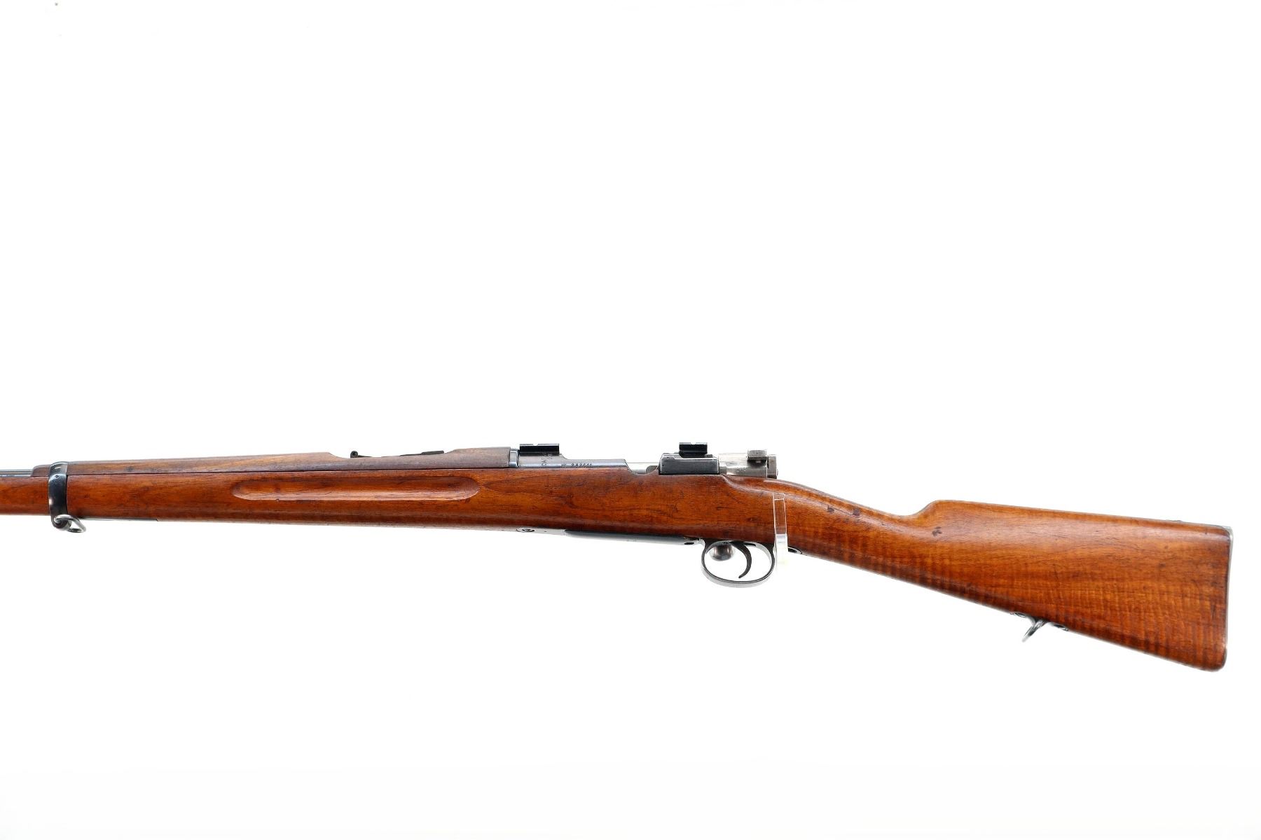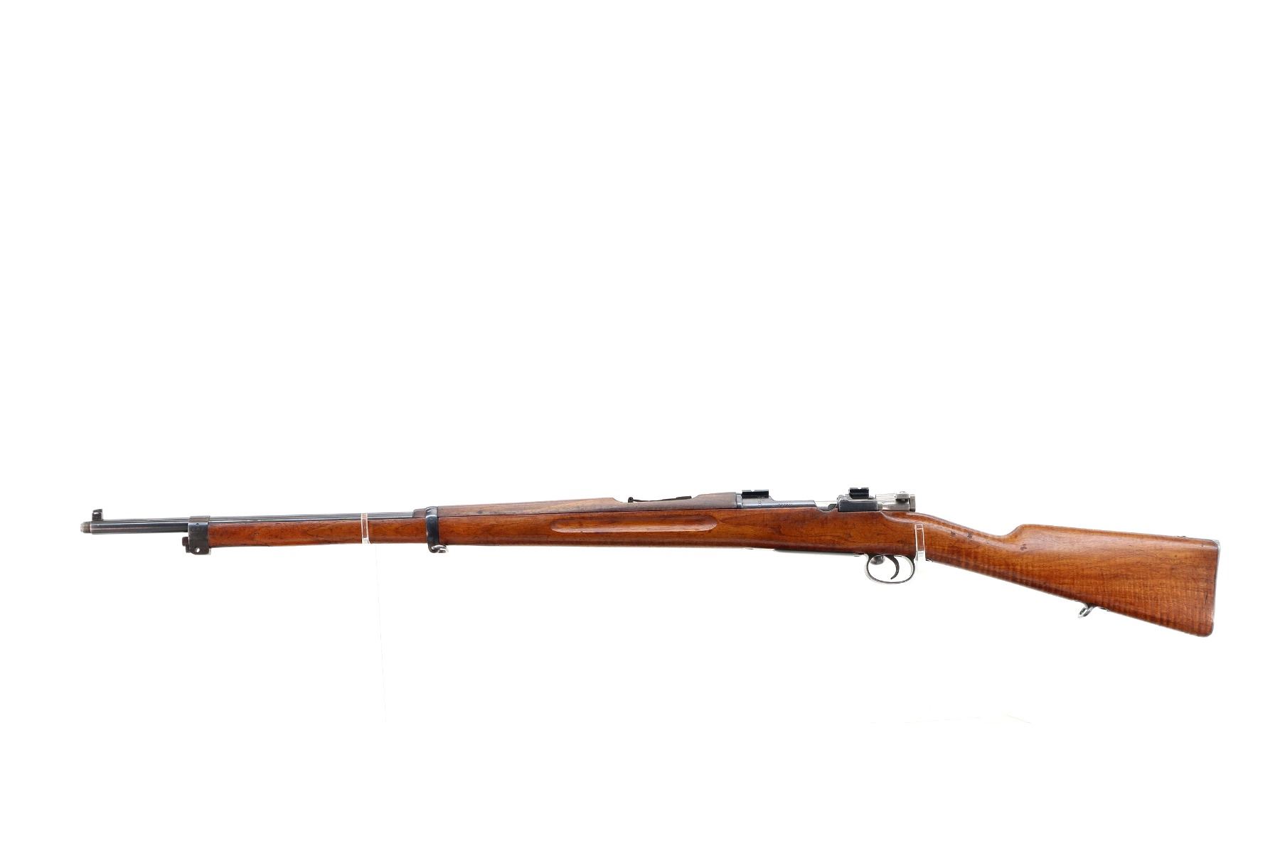 Main Description: Manufactured by Carl Gustafs, serial numbers mismatched. Blade front sight with ramp, missing rear sight base and spring present, blued finish, receiver drilled and tapped with two piece scope bases installed, silver bolt with modified handle, adjustable trigger installed. Two piece full military wood stocks, finger grooved forearm, straight grip, smooth steel butt plate, brass stock disk, sling swivels, bayonet lug, missing cleaning rod.