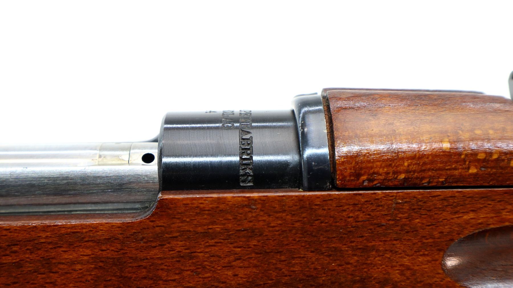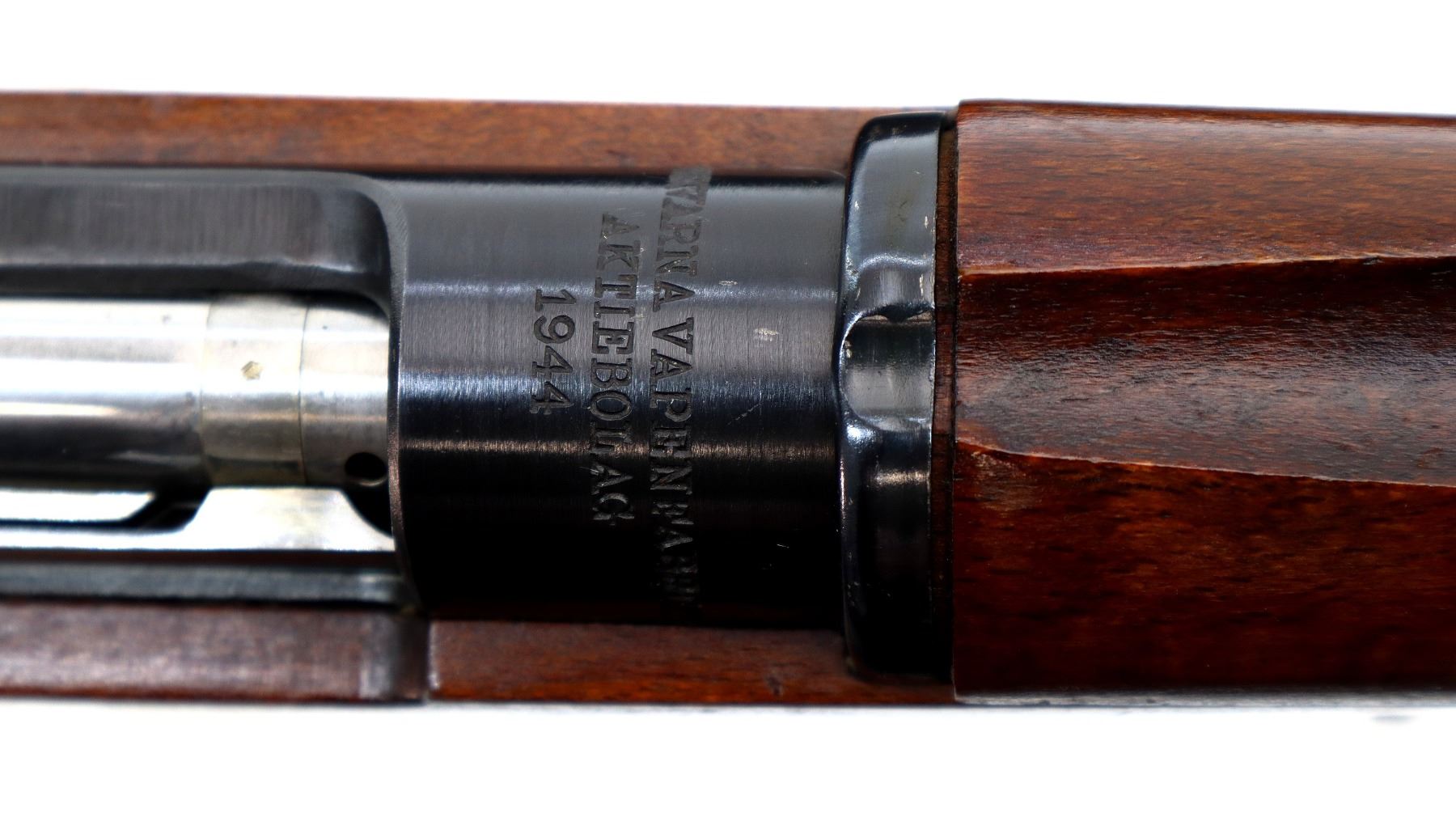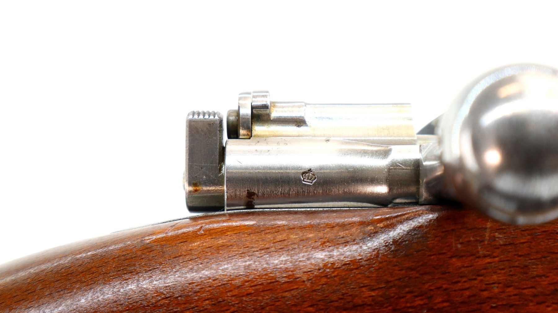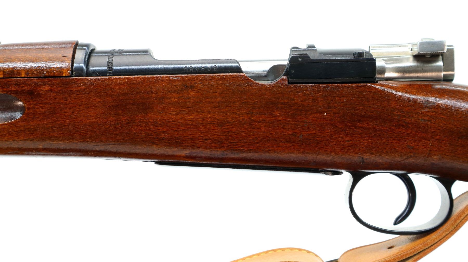 Main Description: Manufactured by Husqvarna 1944, bolt matches. Blade front sight with hood and ramp, adjustable SM rear target sight, blued finish, silver bolt with straight handle. Two piece full military wood stocks, finger grooved forearm, straight grip, smooth steel butt plate, blank brass stock disk, sling swivels with brown leather target sling, brown padding inside of sling is hardened and chipping off, cleaning rod, bayonet lug.