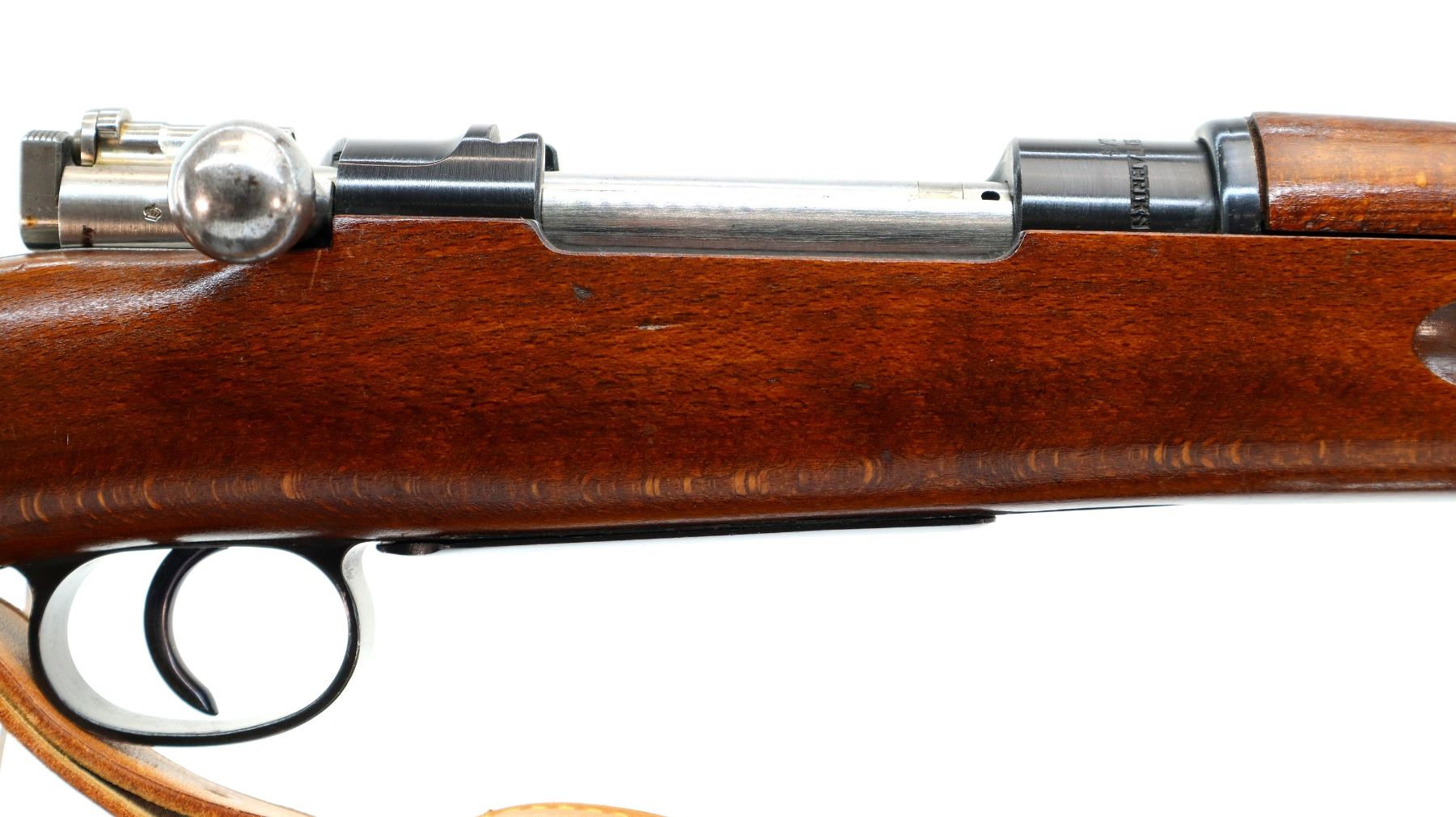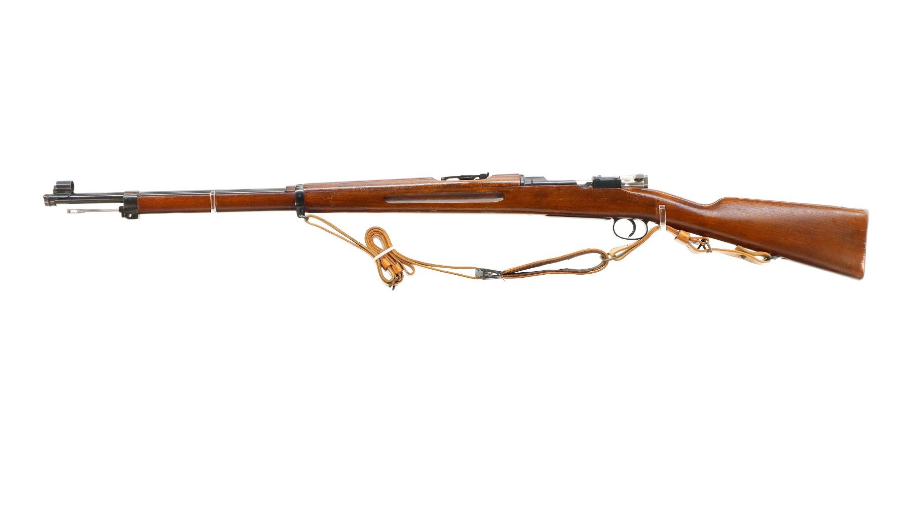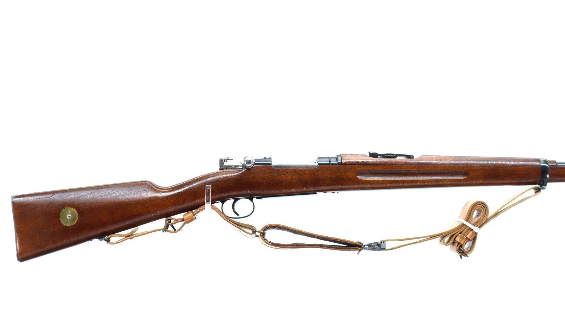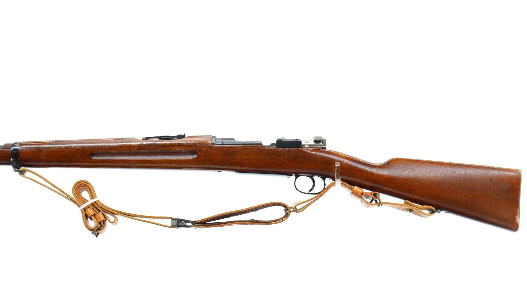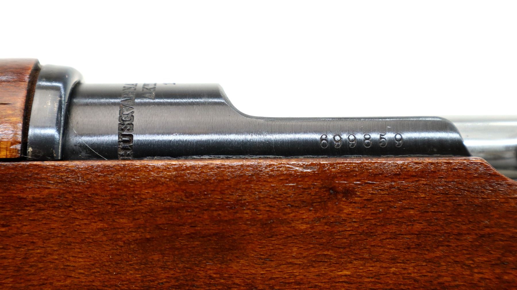 Main Description: Manufactured by Husqvarna 1944, bolt matches. Blade front sight with hood and ramp, adjustable SM rear target sight, blued finish, silver bolt with straight handle. Two piece full military wood stocks, finger grooved forearm, straight grip, smooth steel butt plate, blank brass stock disk, sling swivels with brown leather target sling, brown padding inside of sling is hardened and chipping off, cleaning rod, bayonet lug.