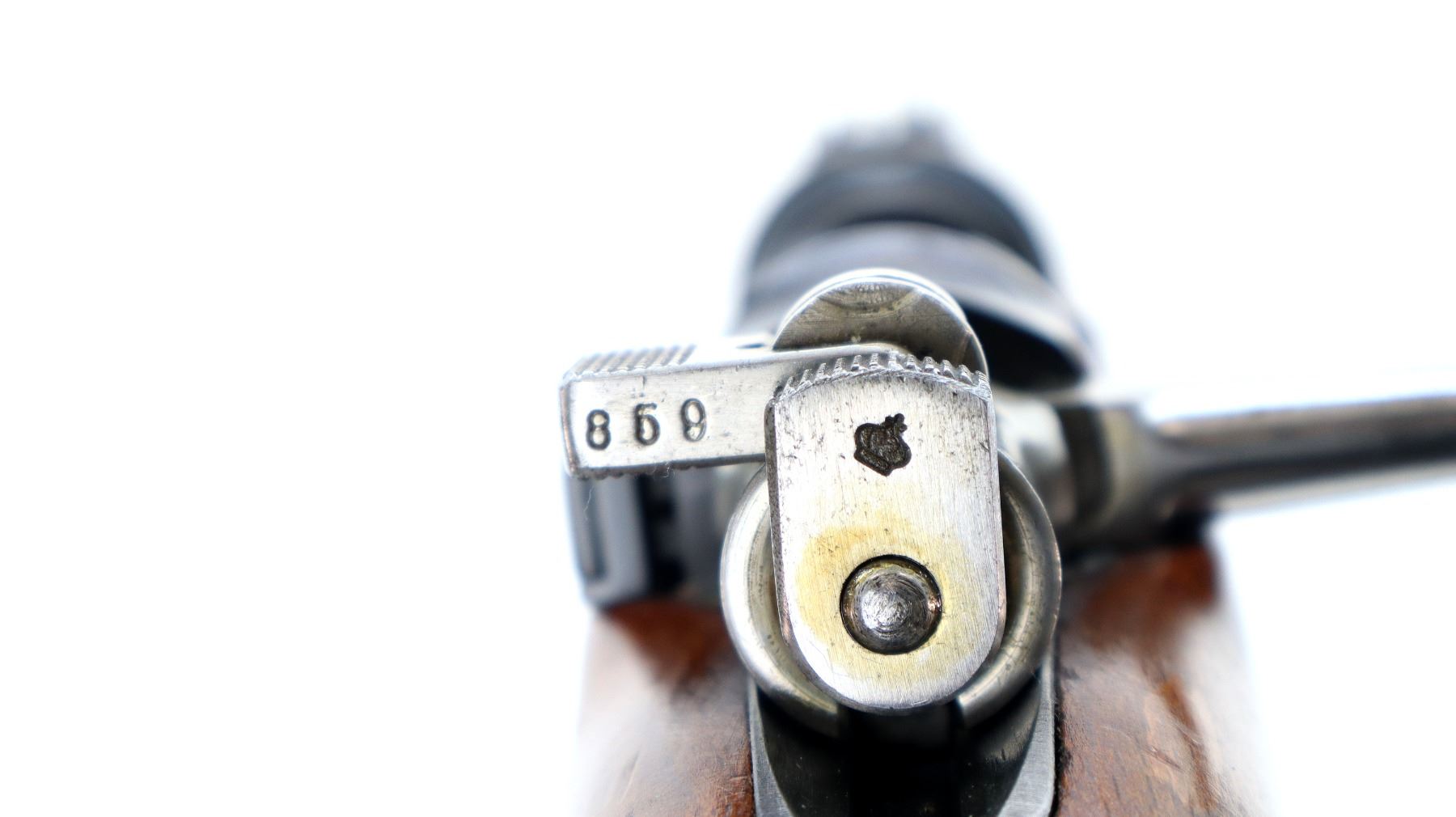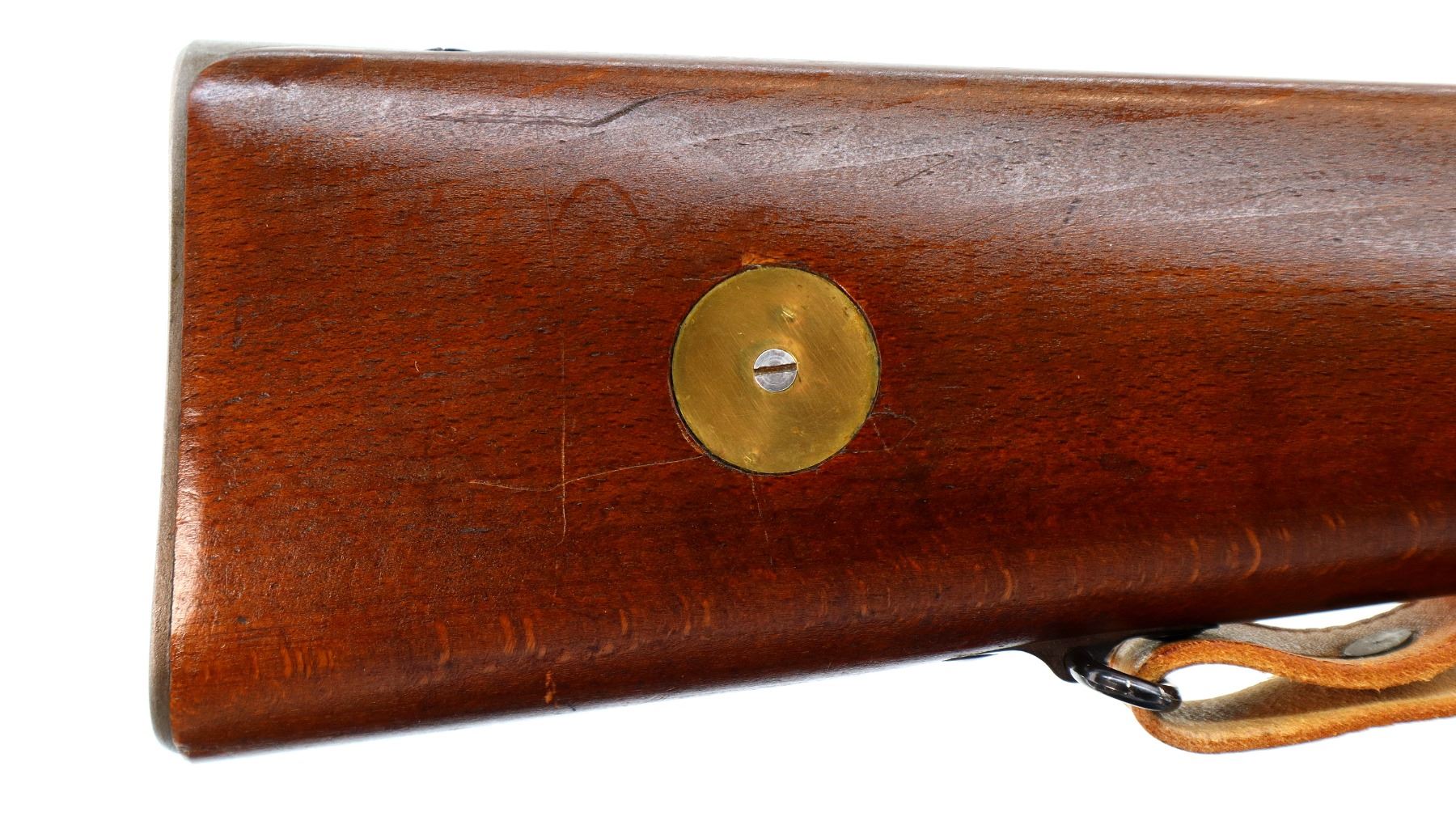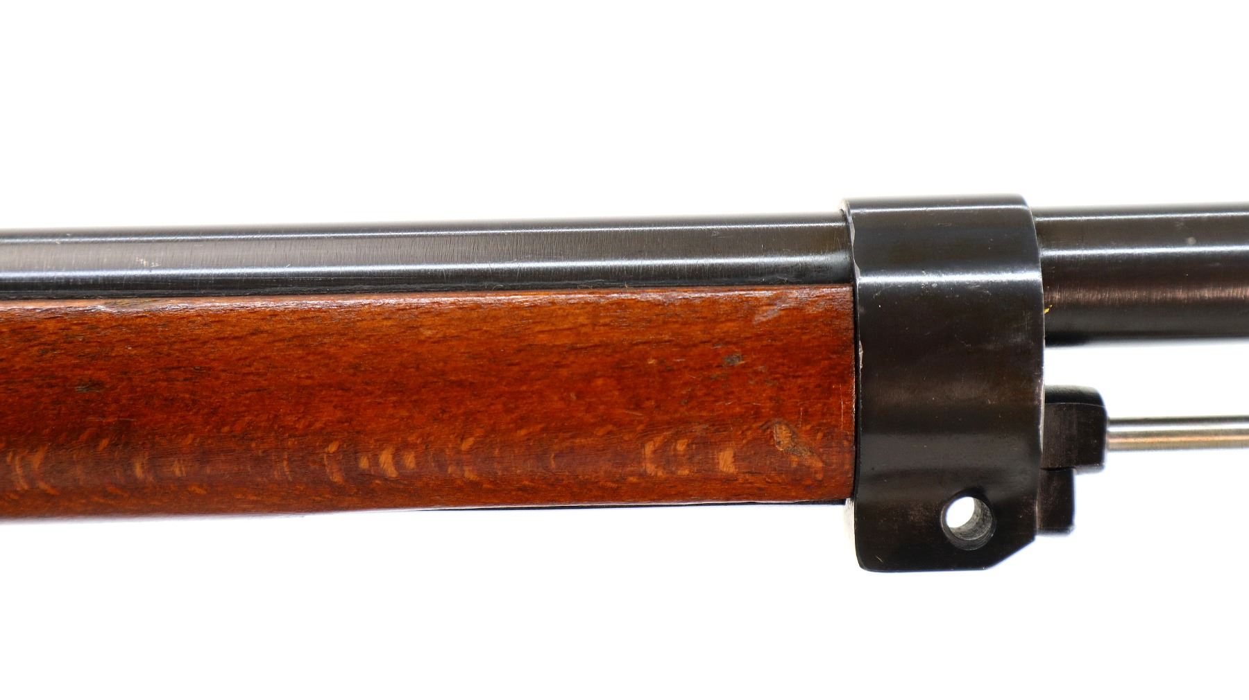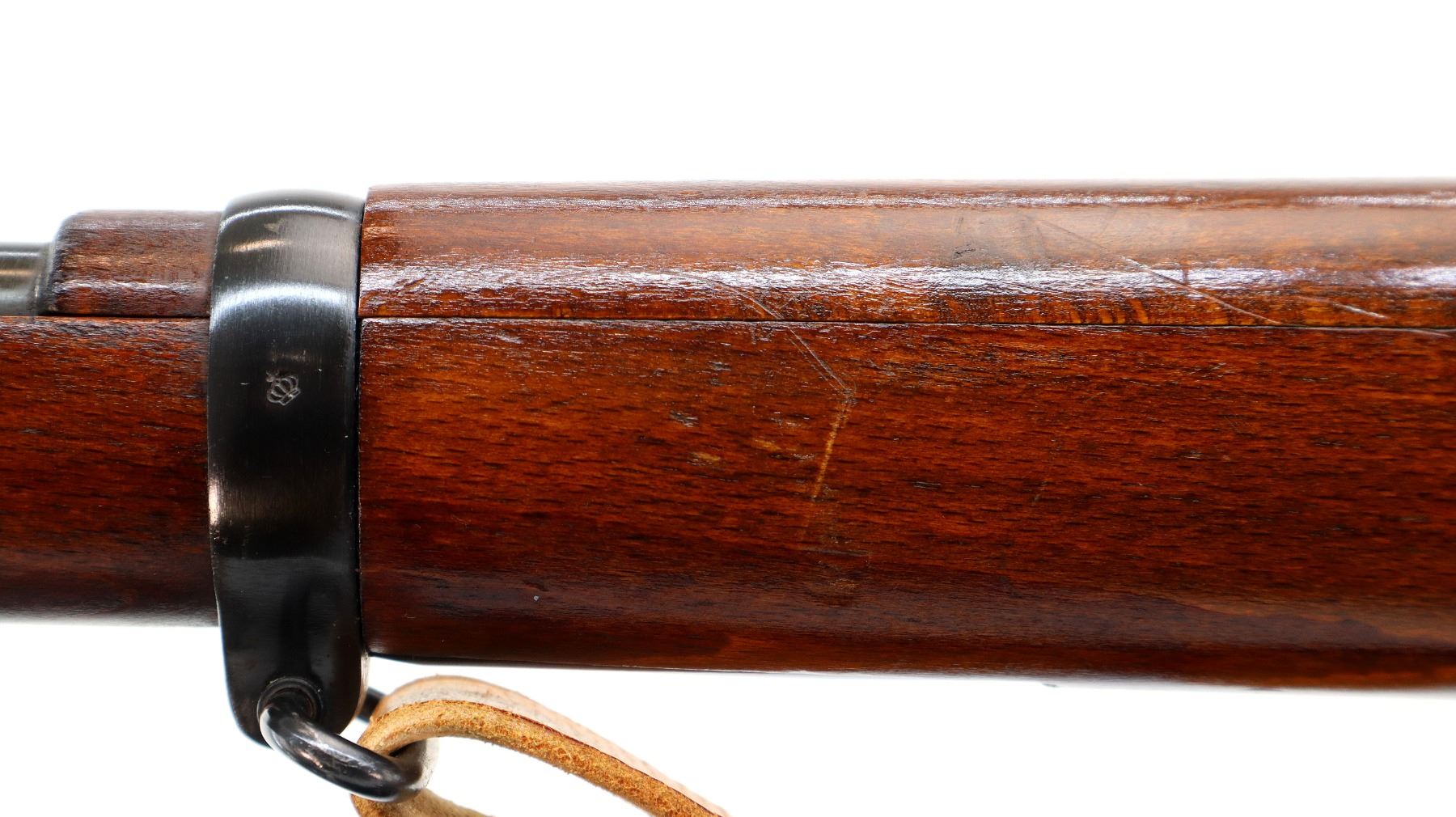 Main Description: Manufactured by Husqvarna 1944, bolt matches. Blade front sight with hood and ramp, adjustable SM rear target sight, blued finish, silver bolt with straight handle. Two piece full military wood stocks, finger grooved forearm, straight grip, smooth steel butt plate, blank brass stock disk, sling swivels with brown leather target sling, brown padding inside of sling is hardened and chipping off, cleaning rod, bayonet lug.