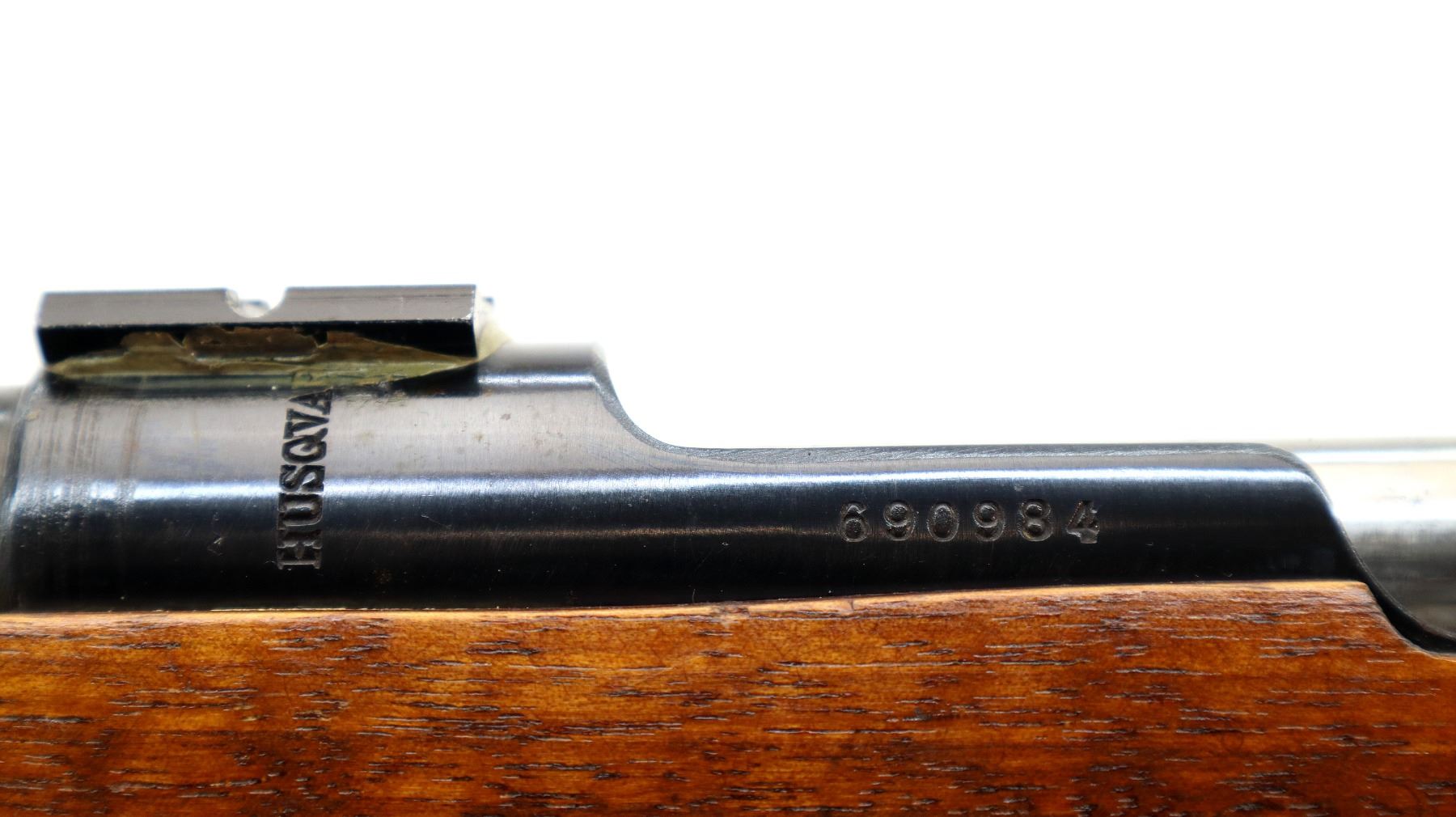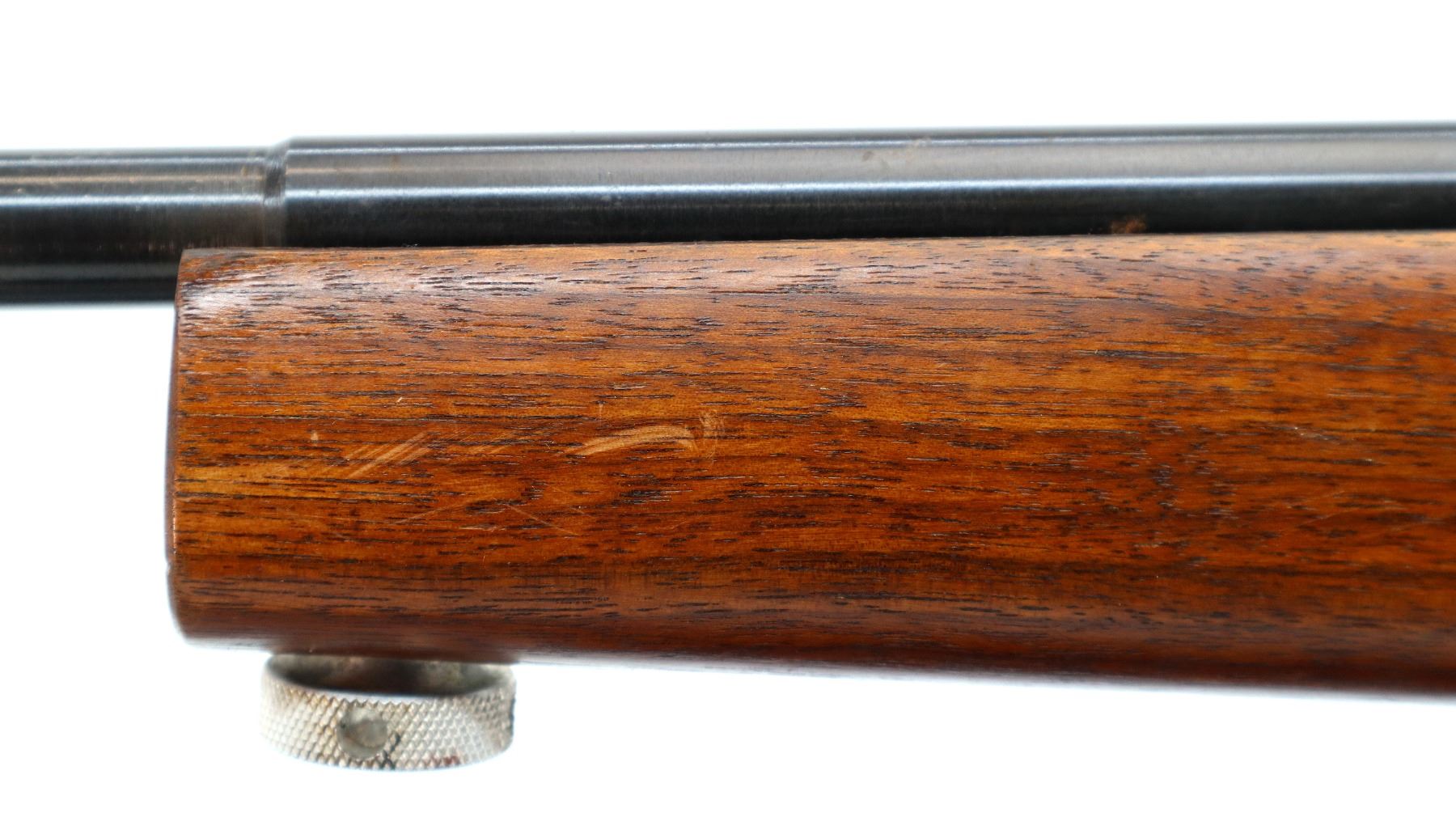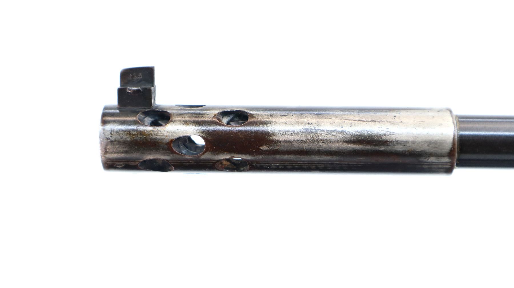 Main Description: Blade front sight with ramp, no rear sight, blued finish, barrel has custom ported brake installed, receiver drilled and tapped with two piece scope bases, modified bolt handle with black polymer knob, low scope safety. One piece wood stock, thumb rest pistol grip, grooved black polymer butt plate, full length rail under forearm and QD swivel studs.
