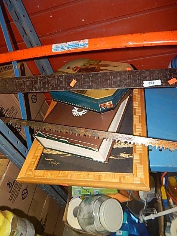 SWEED SAW, LARGE SQUARE, ENGLLISH COLLECTORS TIN, ILLUSTRATED WORLD ENCYCLOPEDIA AND FRAMED BAMBOO PICTURE