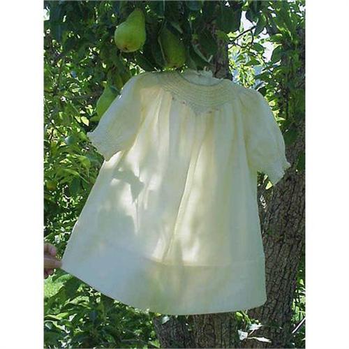 Sweet and exquisite is this darling 1920-30s cream colour Viyella SMOCKED little dress! This is totally hand made with great talent, the workmanship is breathtaking. The delicate smocking is a baby blue with the SWEETEST little pink roses. The dress has a very generous 4 hem and made be extended for an older child if needed. The dress measures about 20 inches in length, shoulder to shoulder about 10 inches, under arm to underarm about 16 inches. The back is also beautifully smocked and has 3 lustrous baby blue mothers of pearl tiny buttons. The condition is excellent no holes, mends or stains, there are a few pinhead size age spots on one shoulder (I believe will come out if treated) definitely not detracting, otherwise perfect! What a delightful little dress to have a girl wear or enjoy displaying the exquisite handwork.