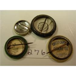 Sweet Corporal cigarette pin backs. Lot of 4. Japan flag, American Jr. Red Cross, US Sesqui-centennial & Mother's Day Carnation. Condition: All good.