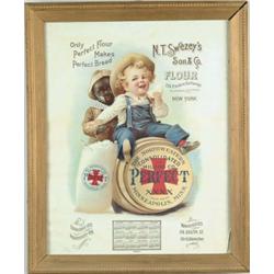 SWEZEY’S FLOUR REPRO CALENDAR. Illustration of children playing with flour barrel. SIZE: 18” w. x 23” h. CONDITION: Some moisture rippling and surface discoloration. PF 1-3668 (20-30)