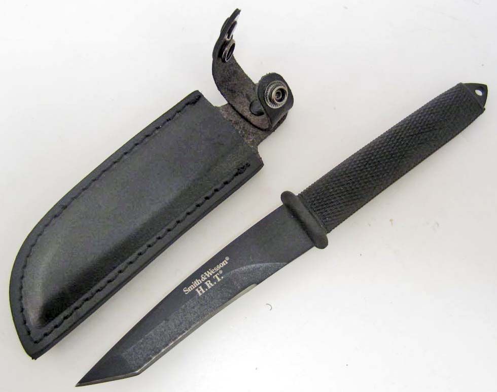 9 1/8" overall. 4 3/4" black powder coated tanto blade. Black rubberized handle. Lanyard hole. Black leather boot clip sheath.