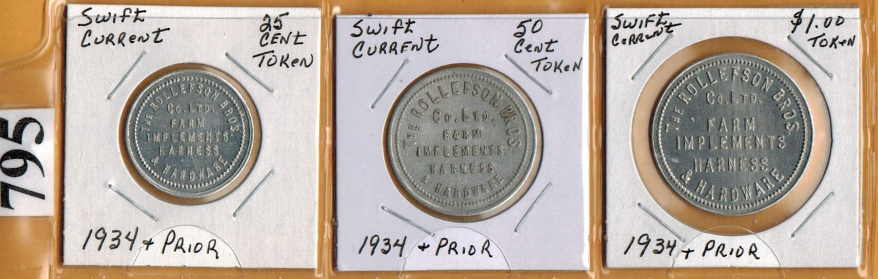 SWIFT CURRENT TOKENS - ROLLEFSON BROS. - Farm Implements & Harness - Lot of 3 Values