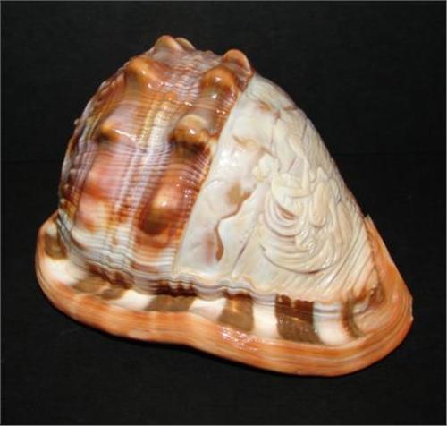 SWIRL GLASS CONCH SHELL. Has relief decorated scene with seated woman with mirror. 3" H, 4.75" L