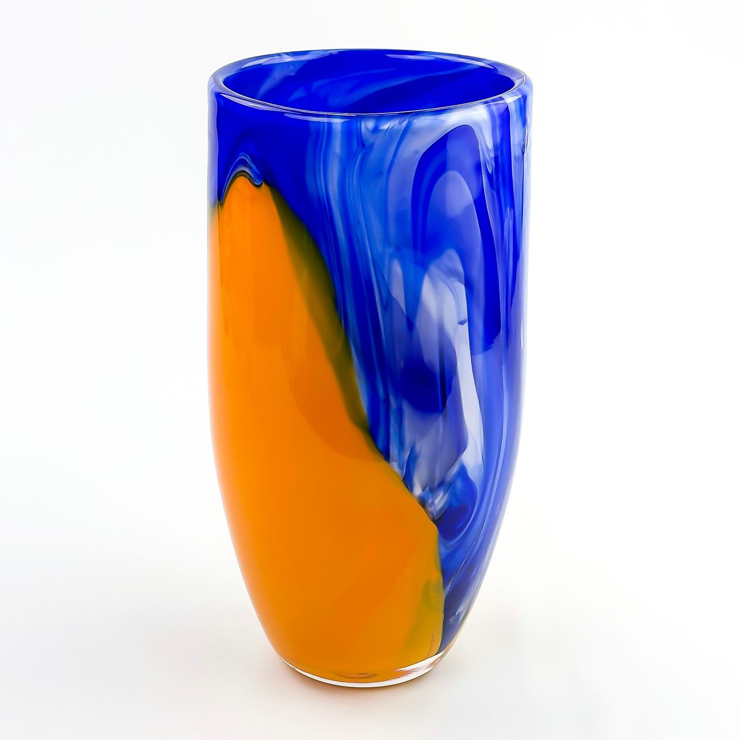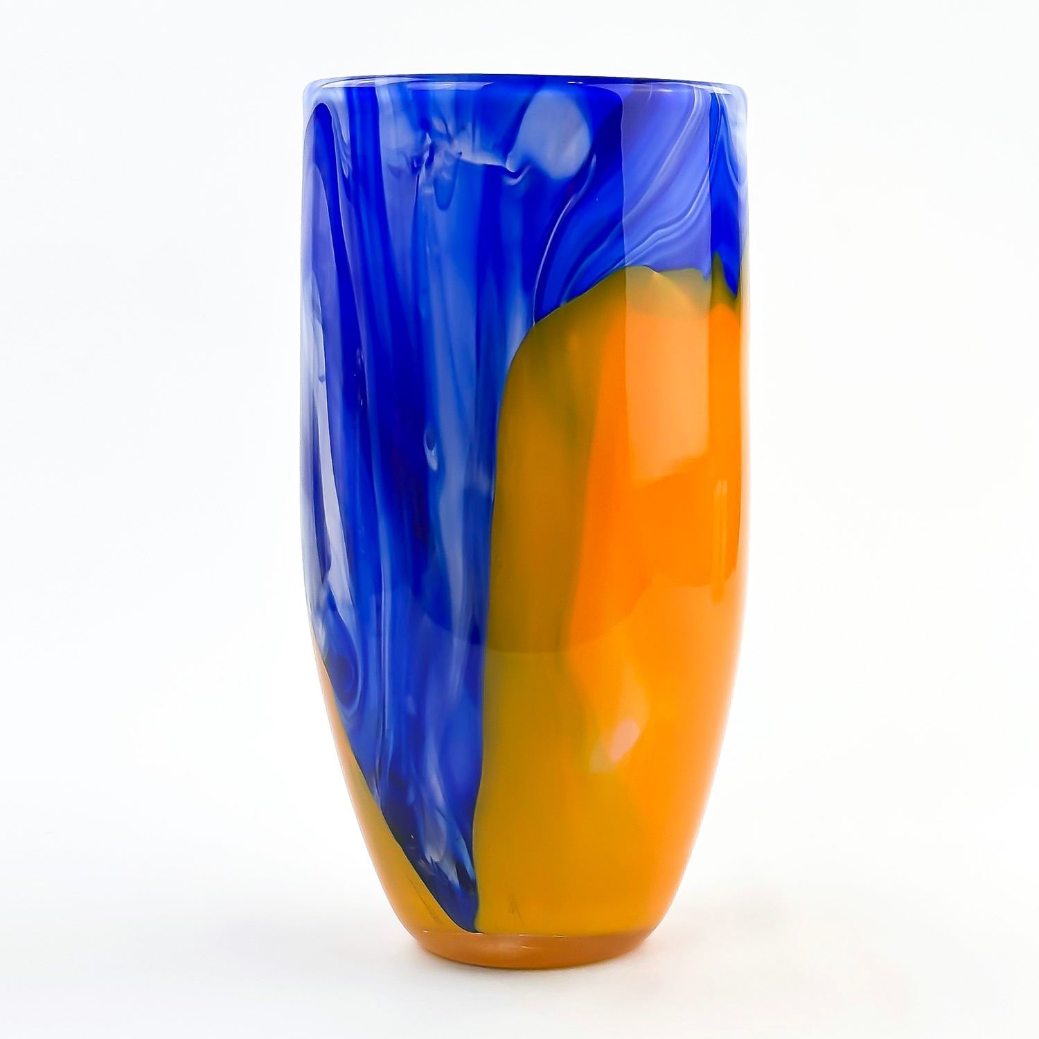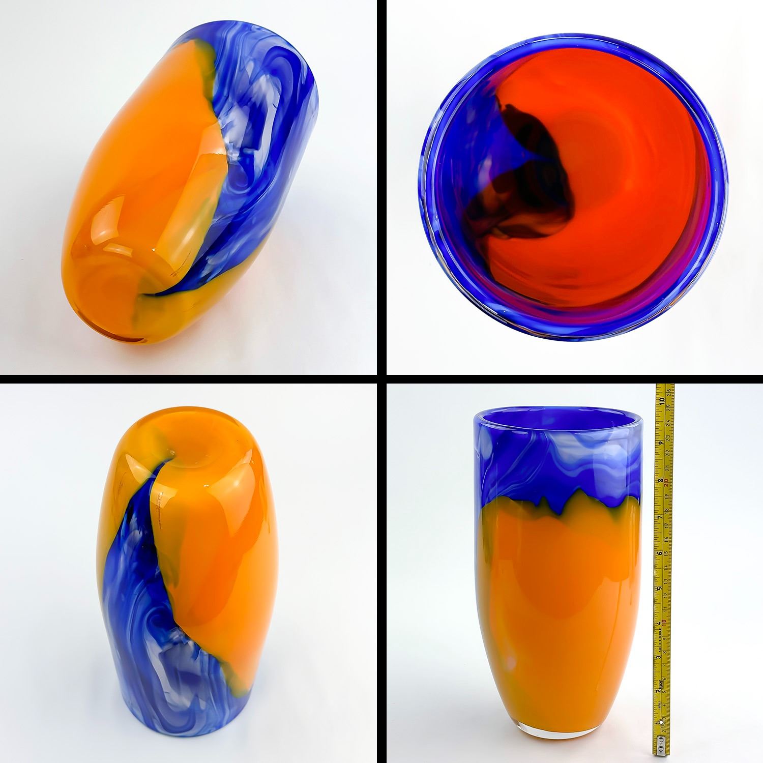 #8017 - SWIRL OR DRIP-LIKE ART GLASS FLOWER VASE. THICK 1/4” GLASS - ARTIST AND MAKER UNKNOWN. MEASURES: 9.5” (24 CM) TALL BY 4.75” (12 CM) TOP OPENING DIAMETER