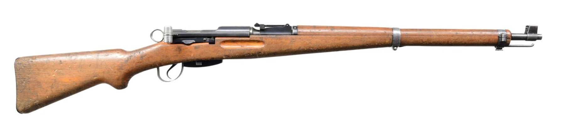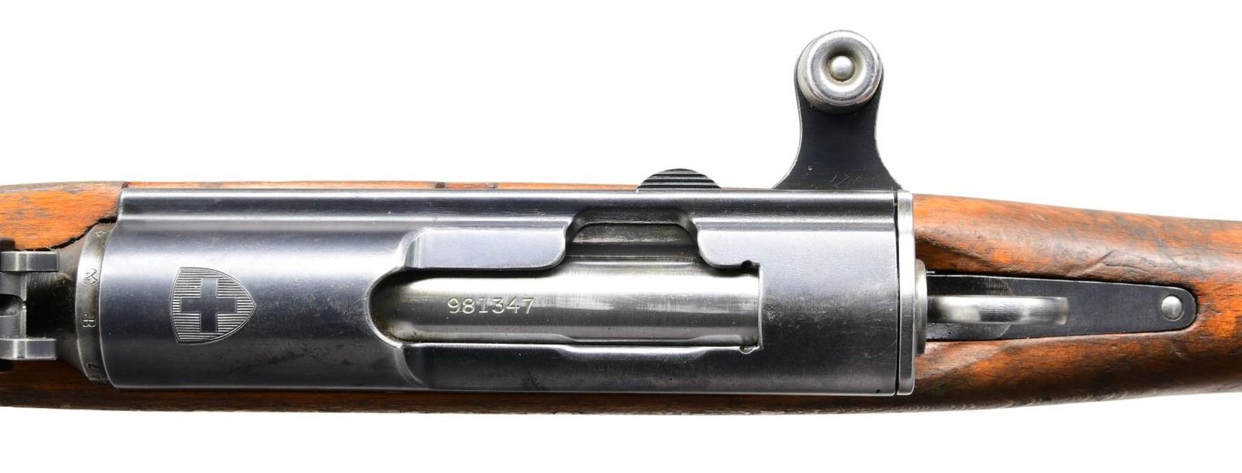 RIFLE WITH AMMO. Cal. 7.5 Swiss (7.5X55mm). S# 981347. Bbl. 25.7” with standard military sights of post with wings at front plus tangent rear graduated to 1,500 meters. Swiss cross in shield over receiver. Improved version of Model 1911 with stronger, front locking lugs on bolt. Standard service rifle from 1933-1958; 528,180 manufactured. Matching numbers on barrel, receiver, bolt and 1 magazine. Stock has 2 “kill notches” on lower front of pistol grip; smooth metal buttplate. No import marks. MAGAZINES: 2 TOTAL of 6 rds.; 1 numbered 981347 and 1 unmarked. UNATTACHED ACCESSORIES: US 50 cal. ammo can with 390 rds. of ammo: 2 Swiss Military match quality 60 rd. bricks plus 5 individual 10 rd. packs. / 8 boxes (20 rds.) Prvi Partisan 174 gr. FMJ BT. / 1 box (20 rds) Norma 180 gr. SP BT. / 2 boxes (20 rds.) Hornady Custom 168 gr. A-MAX. CONDITION: about good stock set with numerous marks throughout. Very good metal finish with most of finish loss on stock bands plus at muzzle area; lesser finish loss on receiver at high edges. No finish on buttplate. Near excellent bright shiny bore. (24-2152/NW). CURIO. $800-1,200.