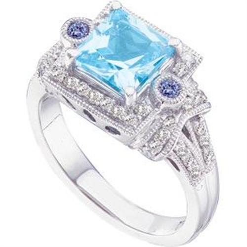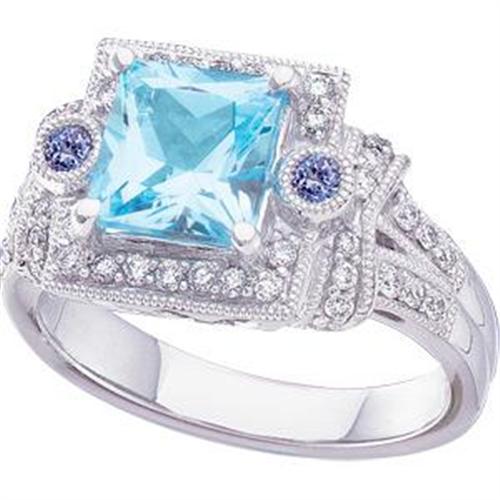 This 14k White Gold ring features a Gorgeous GENUINE SWISS BLUE TOPAZ that is PRINCESS CUT = TWO CARATS! It is accented and surrounded by 46 SPARKLING DIAMONDS = .33 Carats and there is a BLUE IOLITE set each side. This beautiful and unusual ring is a Size 7 and it can be resized just for you. IF YOU LOVE THE COLOR BLUE YOU WILL ADORE THIS RING!