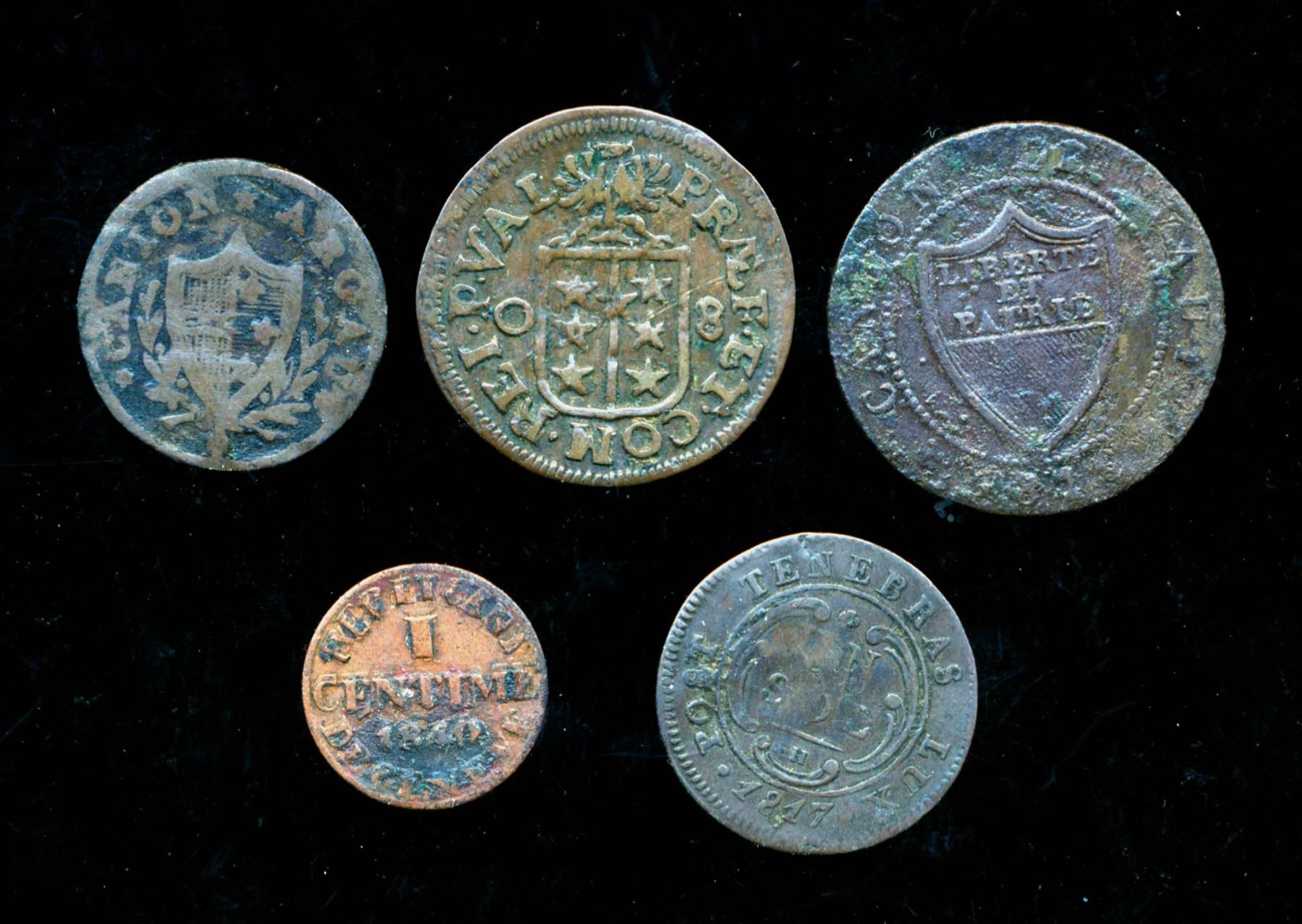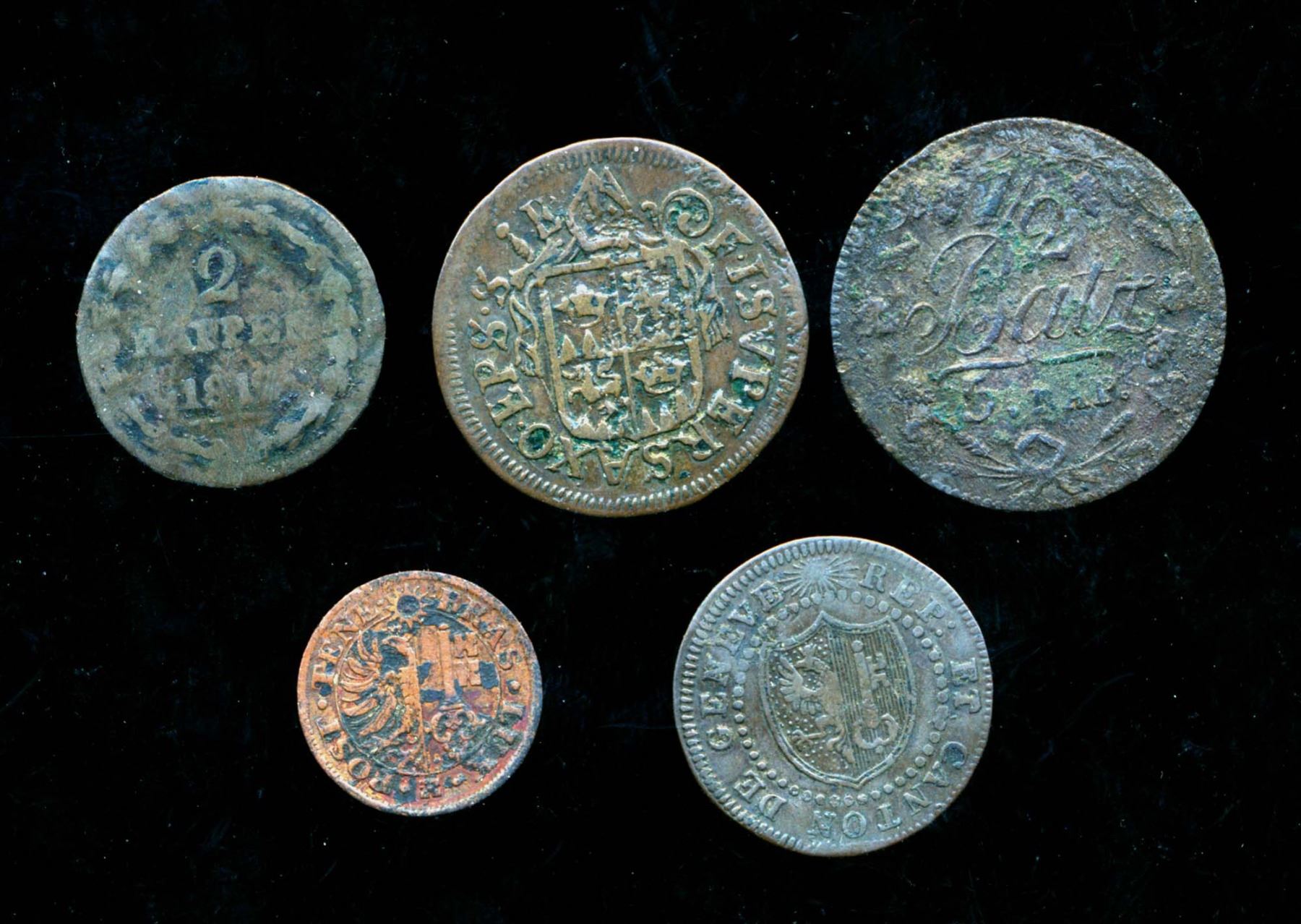1708 Évêché de Sion KM# 26 1/2 batzen Very Fine, 1812 Aargau KM# 11 2 rappens Very Good, Genève KM# 116 1817 sol Fine et 1840 KM# 130 1 centime avec double frappe au revers, Very Fine et Vaud KM# 6 1/2 batzen Good+ avec corrosion.