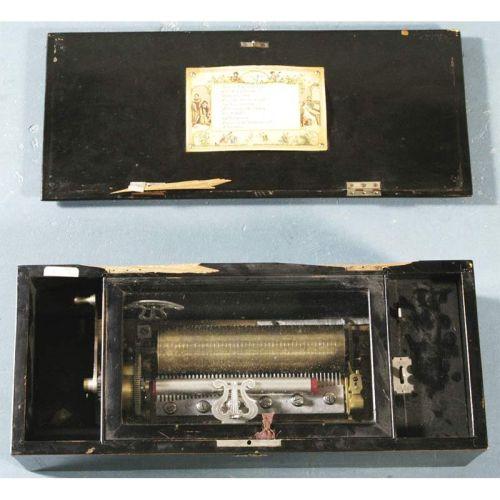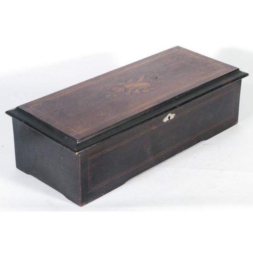 SWISS CYLINDER MUSIC BOX ten tunes with song sheet 20" long, 8" cylinder early 20th century, CONDITION REPORT: lid detached and hinges broken away with damage to back side of case. The piece broken away from right hinge is NOT present, left side is. Escutchen damaged. Plays, but doesn't have great sound.