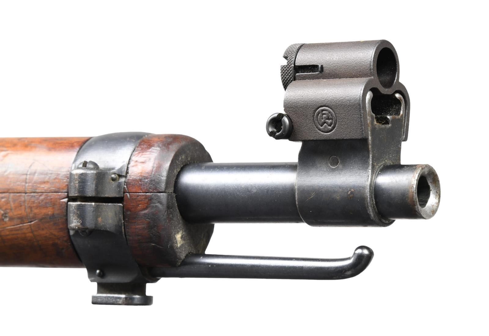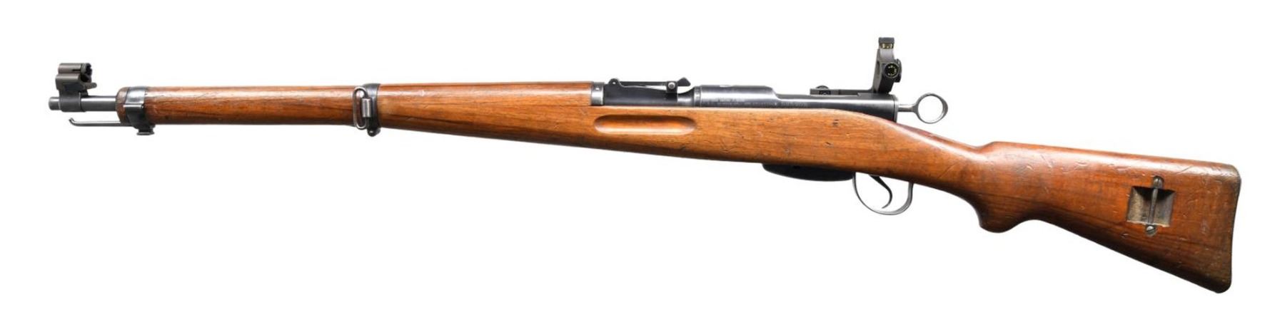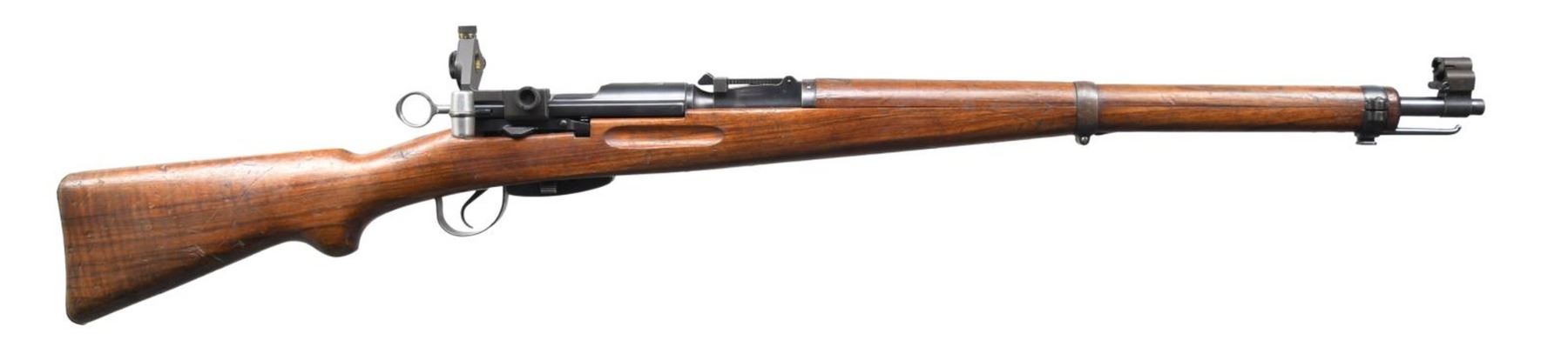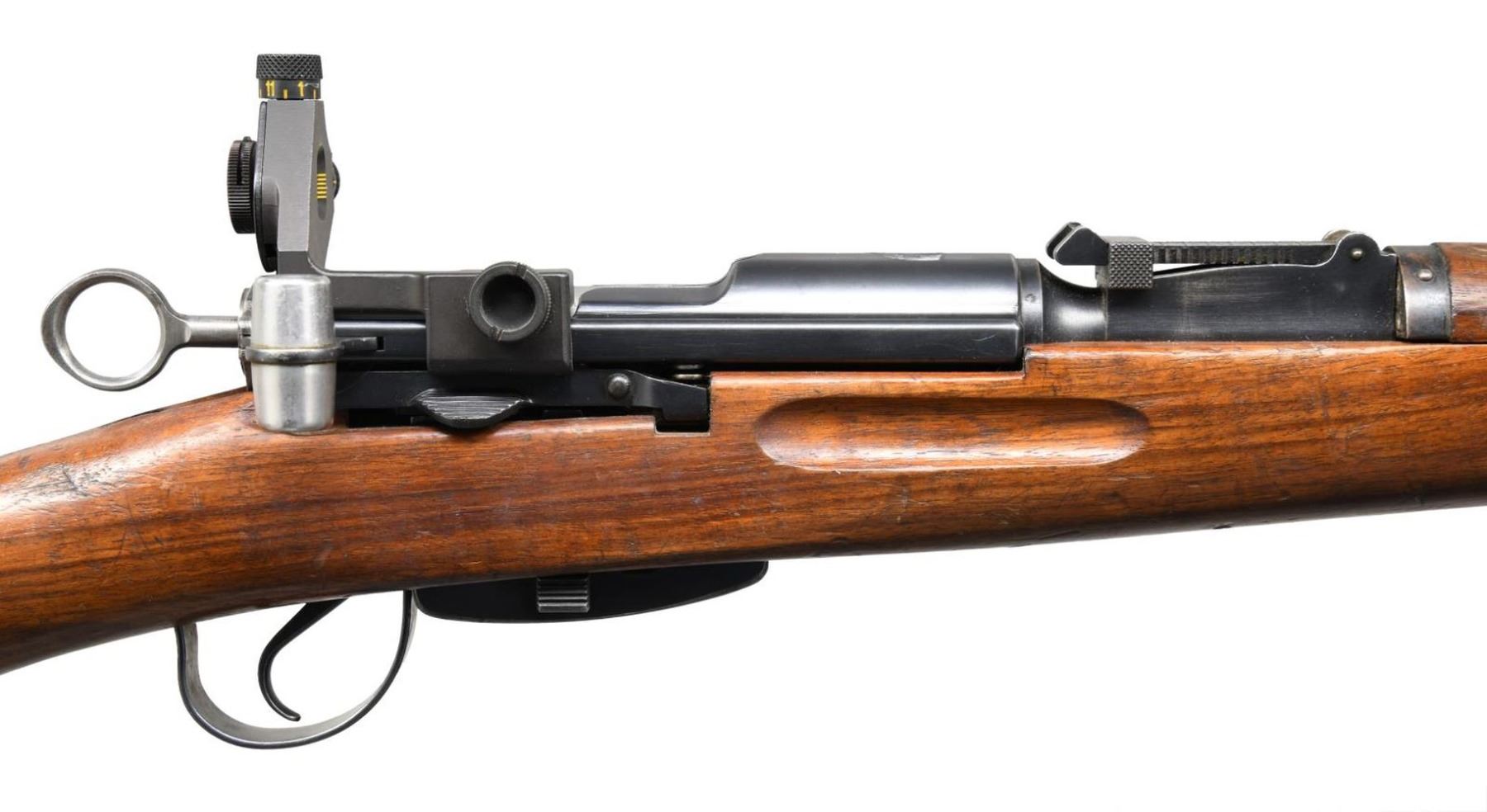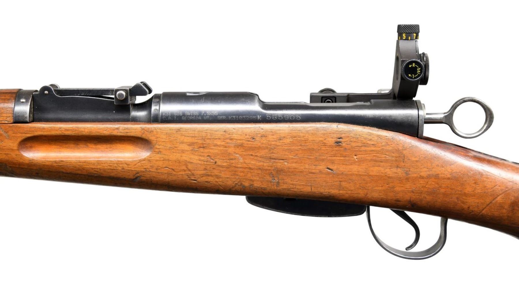 RIFLE WITH W F TARGET SIGHTS. Cal. 7.5X55 Swiss. S# 585905. All visible numbers match. Import marked on left side of receiver. Bbl.25 5/8". Tangent rear sight graduated to 1500 meters. Blade front sight w/ protective ears. Rifle is fitted w/ "WF" target clamp on sights. Diopter rear sight is fully adj. including eye piece. The sight clamps on the right receiver rail ahead of the bolt handle. Front globe sight w/ interchangeable inserts clamps on sight ears. Sight is equipped w/ post insert. Receiver is marked on top w/ Swiss cross. Aluminum bolt handle. Bayonet lug & stacking bar are present. Walnut stock set w/ provision for side sling. Right side of butt has acceptance mark. MAGS: 1 matching 6 rd. CONDITION: stock set has moderate wear staining & handling marks throughout & sm crack underneath forend at front of trigger guard and notable dent on top of handguard at the right rear. Metal has 70% worn thinning blue finish w/ scattered small spots of oxidation. Very good shiny bore w/ sharp lands. (24-1638/RW). CURIO $1,000-1,500.