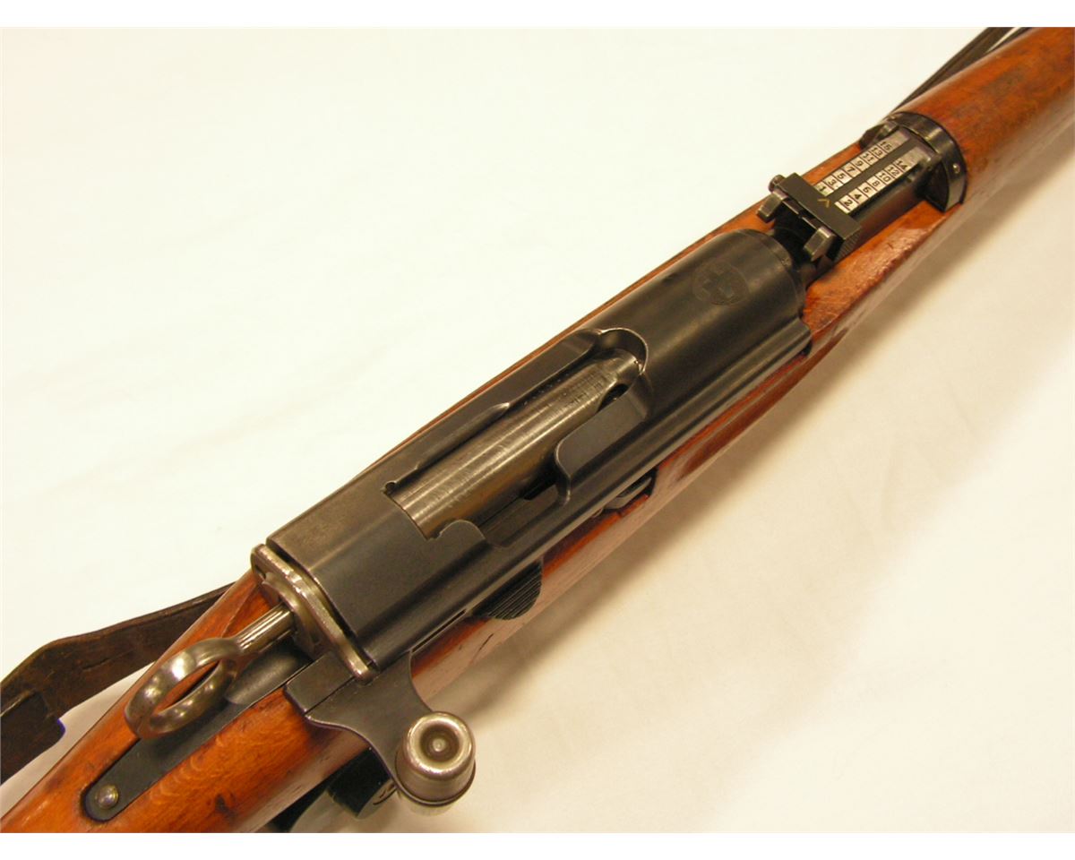 The Karabiner Model 1931 (K31) is a magazine-fed, straight-pull bolt-action rifle. It was the standard issue rifle of the Swiss armed forces from 1933 until 1958, though examples remained in service into the 1970s. It has a 6-round removable magazine, and is chambered for the 7.5x55mm Swiss (also known as Gewehrpatrone 1911, GP11, or unofficially 7.5x55mm Schmidt Rubin), a cartridge with ballistic qualities similar to the 7.62x51mm NATO/.308 Winchester cartridge. Each rifle included a 6 round detachable box magazine with matching stamped serial number. A charger is used to load the magazine from the top of the receiver.