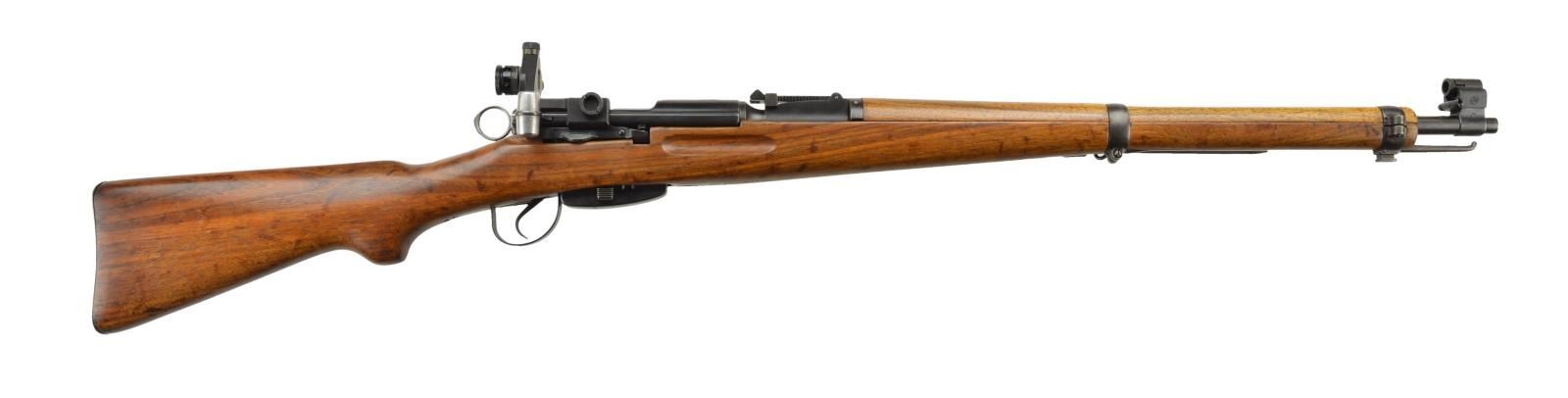 Cal. 7.5x55 Swiss. S #813695. All visible S #'s matching. Bbl. 25 1/2" w/ import marking. 1943 Mfg. date stamped on stock under buttplate. Top of receiver marked with Swiss cross shield. Upper tang marked w/ a "P" and "FR". Tangent rear sight graduated to 1500 meters. Rifle also furnished w/ F&W diopter fully adjustable rear sight. F&W globe target front sight. Left side sling swivels w/ leather sling. Walnut stock. MAGS: 1 Detachable 6 rd. numbered matching to rifle UNATTACHED ACCESSORIES: Brass muzzle cover, leather front sight cover and rubber F&W rear sight cover. CONDTION: refinished walnut stock has 2" tight grain crack in right grasping groove and some light handling wear. Metal retains 60% arsenal reworked blue w/ areas of touch up blue, bands and Bbl. fading to gray patina, some high edge wear and blued over pitting on receiver. Excellent bright bore. (22-2585/MJC). CURIO. $500-800.