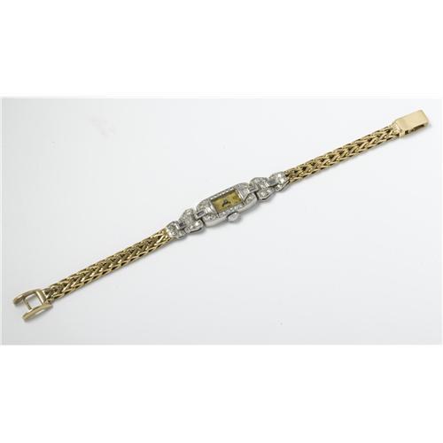 <B>SWISS LADY'S, DIAMOND, PLATINUM, 18K GOLD WRISTWATCH</B></I><BR><BR>Case: 26.00 x 10.00 mm, rectangular platinum with attached single lug on either end. French hallmarks.<BR>Dial: silvered with black Arabic numerals and stick Hour Indexes, blued steel "Dart" hands, mineral crystal.<BR>Movement: Swiss 15 jewels.<BR>Bracelet: hinged diamond set platinum links attached to an 18k yellow gold wheat link chain, completed by a foldover clasp.<BR>Notes: The case and bracelet feature a combination of single, baguette and trapeze-cut diamonds weighing a total of approximately 1.20 carats. Gross weight 26.30 grams<BR><BR> <B>Condition Report:</B> Watch is currently in working order, discoloration and damage on both dial and crystal noted, caseback has had engraving removed.<BR><BR><b>Shipping:</b> Miscellaneous Collectibles, Smal (<a target="_blank" href="http://www.heritageauctions.com/common/shipping.php">view shipping information</a>)