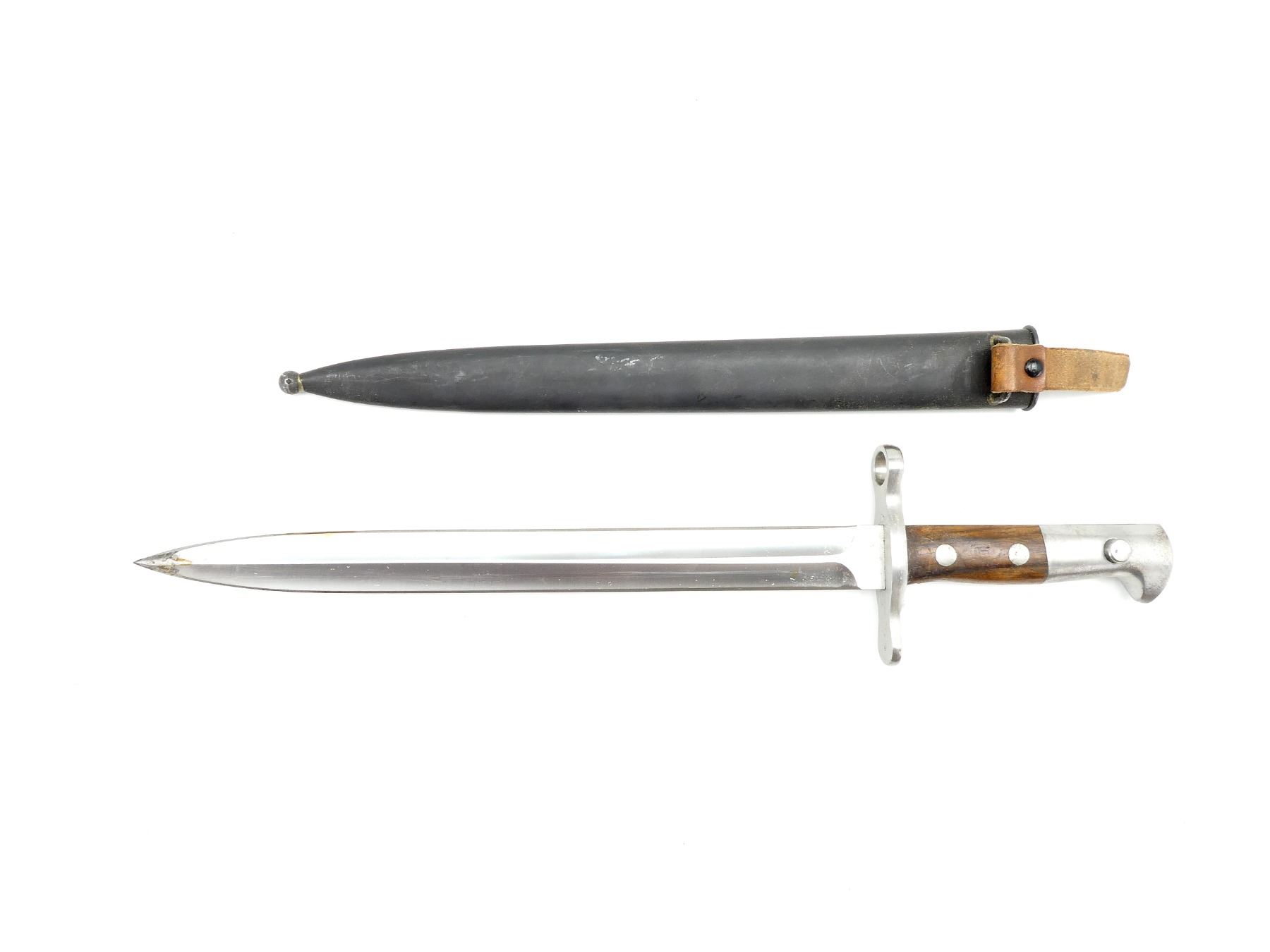 (1) FITS 7.5MM M1911 CARBINES & M1931 SHORT (K31) RIFLES, RICASSO MARKED: "ELSENER, SCHWYZ, VICTORIA", CROSS-PIECE MARKED WITH SWISS CROSS & PROOF MARK, 2-PIECE WOOD GRIP, METAL POMMEL, NO VISIBLE MARKINGS, STEEL SCABBARD WITH LEATHER TAB, THROAT MARKED: "P", UNDER LEATHER TAB MARKED: "P", BALL-TIP HAS SWISS CROSS, BLADE APPROX. 11 7/8" & OAL APPROX. 17". SEE PHOTOS.