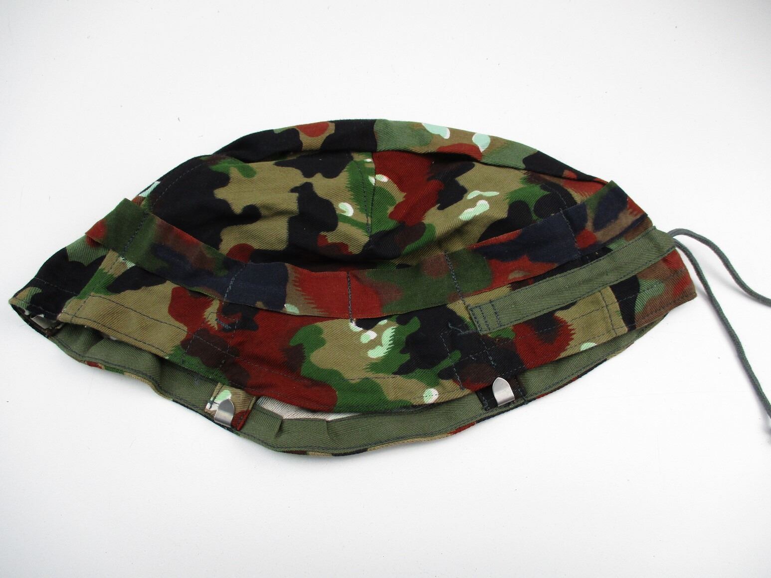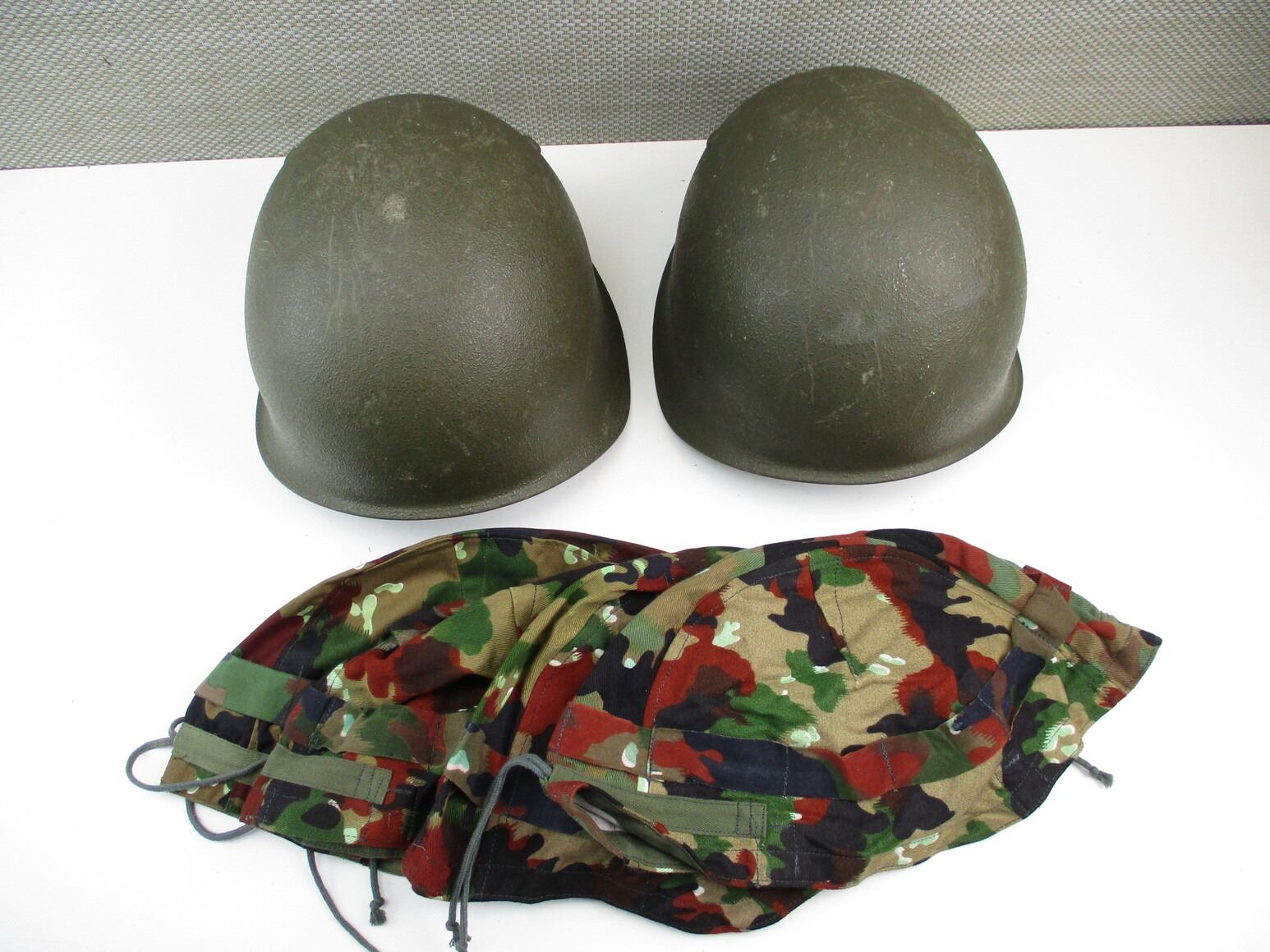 SWISS M71 MILITARY HELMETS/COVERS , (2) GREEN TEXTURED PAINT, LEATHER LINER, CHIN STRAP, PADDED ALUMINUM RING. MARKED 57-58. (4) SWISS MILITARY HELMET COVERS.