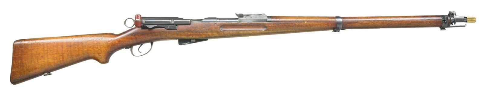 Cal. 7.5x55. S #381142. Bbl. 30 1/2". Bolt knobs are unnumbered but all other visible parts are matching. Top off bbl & receiver marked w/ Swiss proofs. Left side of bbl. marked w/ "P" private purchase marking below S #. Tangent rear sight graduated to 2000 meters. Blade front sight. Stacking bar & bayonet lug are present. European walnut stock set w/ Swiss acceptance stamp on right side of butt. Top of comb marked "VALAIS" for the Swiss canton. MAGS: 1 matching numbered detachable 6. rd. UNATTACHED ACCESSORIES: brass & steel muzzle cover. CONDITION: walnut stock set retains strong arsenal oil finish w/ a small chip behind upper tang, scattered dings & handling marks. Metal retains 60% thinning original blue w/ scattered wear & a few areas of light oxidation. Very good bore showing a hint of frosting. (22-2558/MJC). CURIO. $300-500.