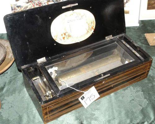 SWISS "PICCOLO" CYLINDER MUSIC BOX with 12" cylinder and inlaid lid, circa 1870, condition: attic found, somewhat dirty, but mechanically sound, teeth intact