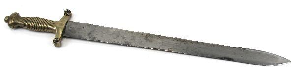 Swiss sawback pioneer short sword. Similar in appearance to the French Model 1831, especially in the hilt. 20 inch blade, with saw edge on back, and one piece brass hilt. Overall good condition, with no scabbard.