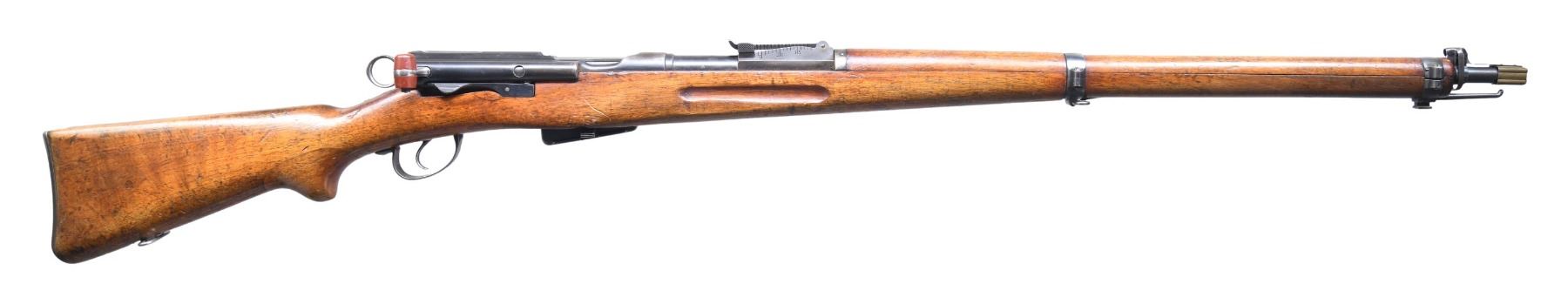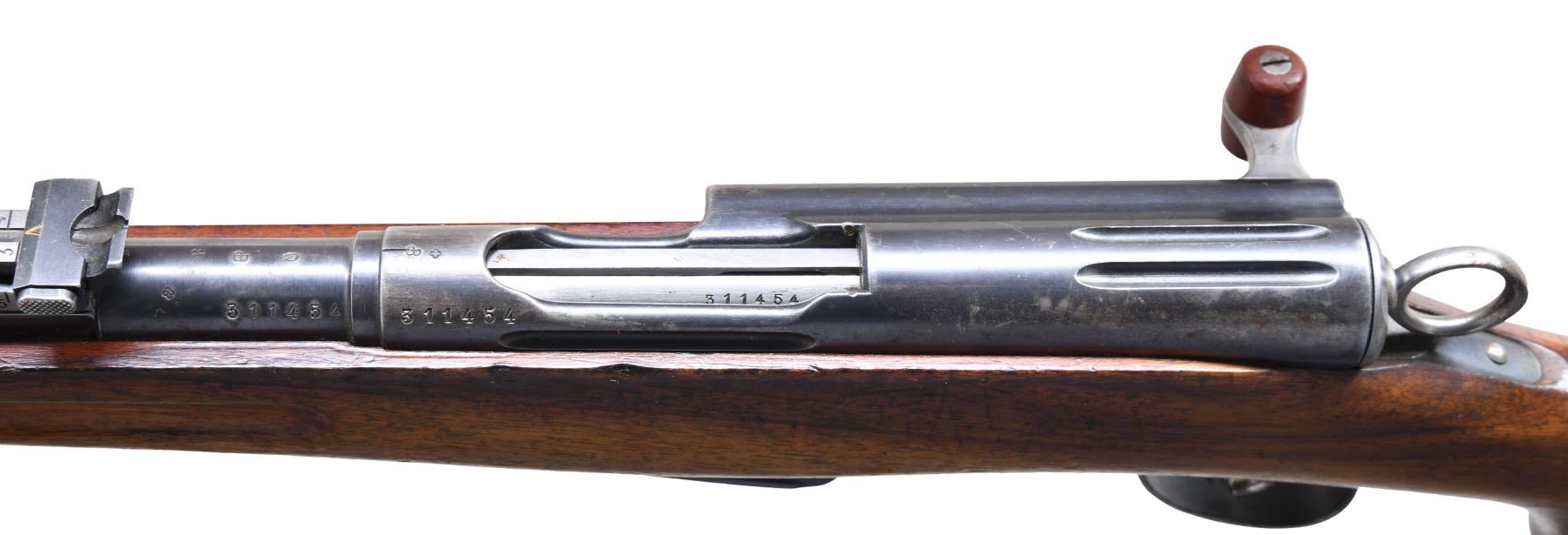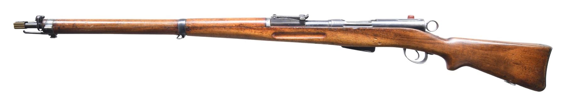 BOLT-ACTION MILITARY RIFLE. Cal. 7.5 Swiss. S# 311454. All visible numbers match. Bbl. 30 3/4". Tangent rear sight graduated to 2,000 meters. Blade front sight. Bbl. & receiver marked w/ "BP" proofs, Swiss cross & "B" markings. Red composite bolt handle. Walnut stock set w/ arsenal added pistol grip. MAGS: 1 detachable 6 rd matching. UNATTACHED ACCESSORIES: brass & steel muzzle cover. CONDITION: stock set shows the wear & handling marks from considerable service use. Metal retains 75% original blue w/ thinning as well as light wear. Bottom half of bolt knob has missing piece. Very good shiny bore. PROVENANCE: From the Lifelong Collection of George Staden S&W Member #3451. (25-191/RW). MODERN. $300-500.