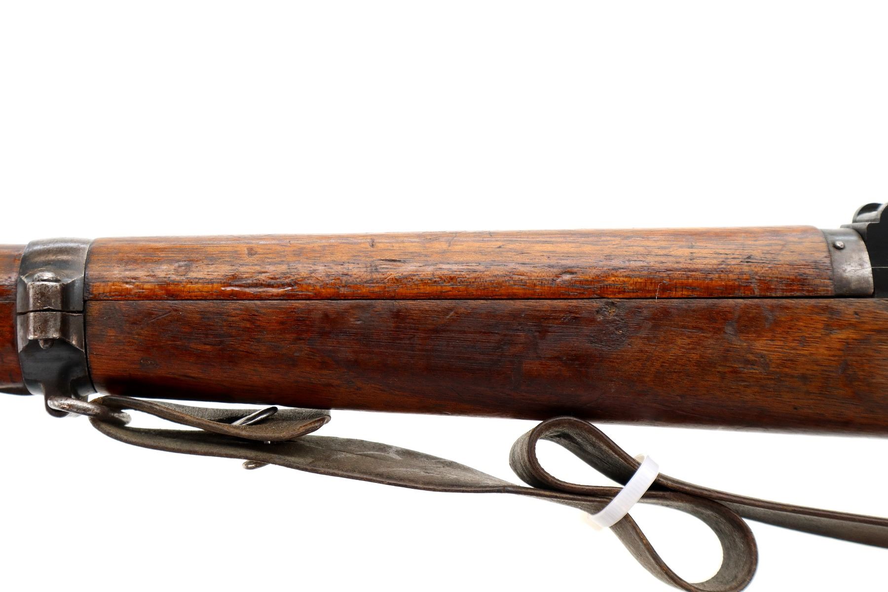 Main Description: Manufactured 1915. Visible numbers match. Blade front sight with ramp, adjustable u notched rear sight, blued finish, silver bolt with two piece brown polymer knobs which are damaged. Two piece full military wood stocks, finger grooved forearm, pistol grip, cracked behind upper tang, smooth steel butt plate, sling swivels with brown leather sling, bayonet lug, stacking hook.