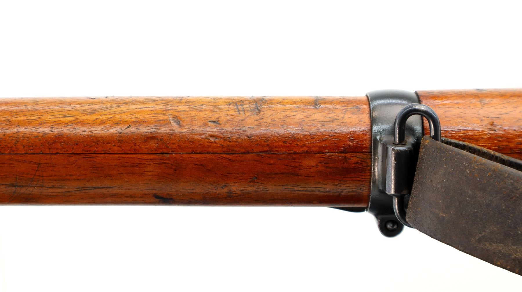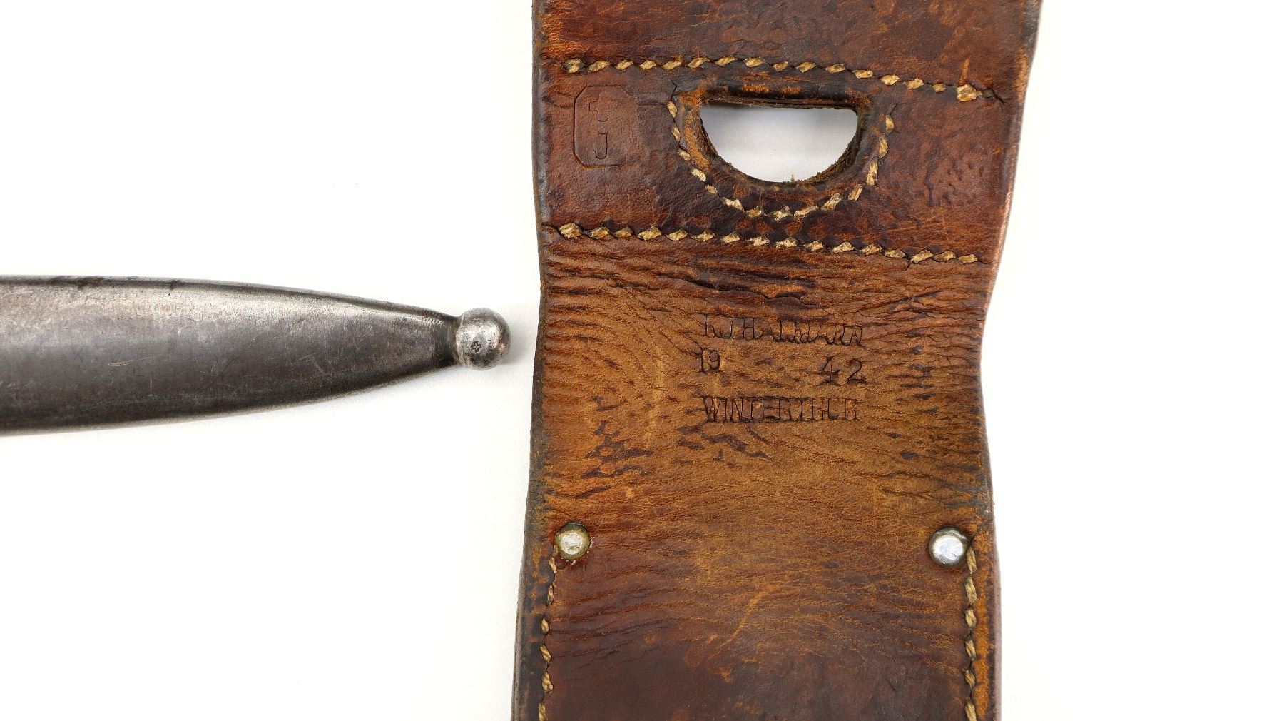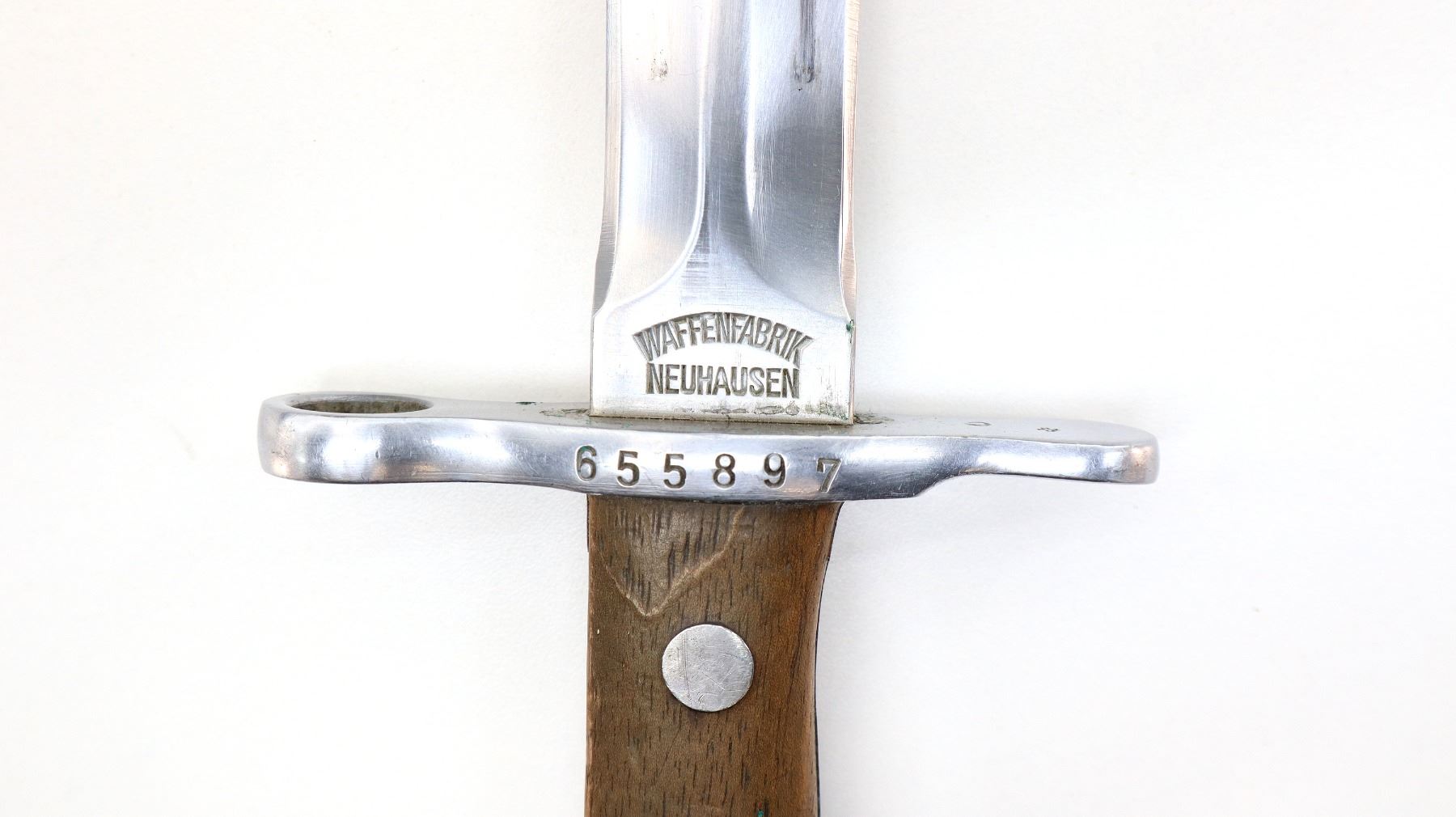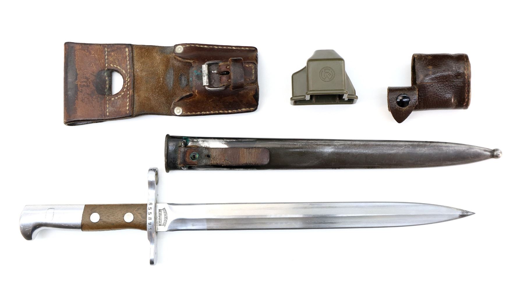 Main Description: Manufactured 1941, visible numbers match. Has original blade front sight with ears and ramp and adjustable u notched rear sight, also has Globe front sight and clamp on fully adjustable rear peep sight installed. Blued finish, Swiss crest on receiver ring, silver bolt with two piece alloy knobs. Two piece full military wood stocks, finger grooved forearm, pistol grip, smooth steel butt plate, sling swivels with brown leather military sling, bayonet lug, stacking hook. Bayonet Manufactured Waffen Fabrique Neuhausen with matching serial number, wood grips, blued steel scabbard, black leather frog dated 1942.
